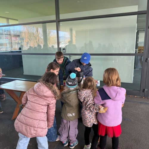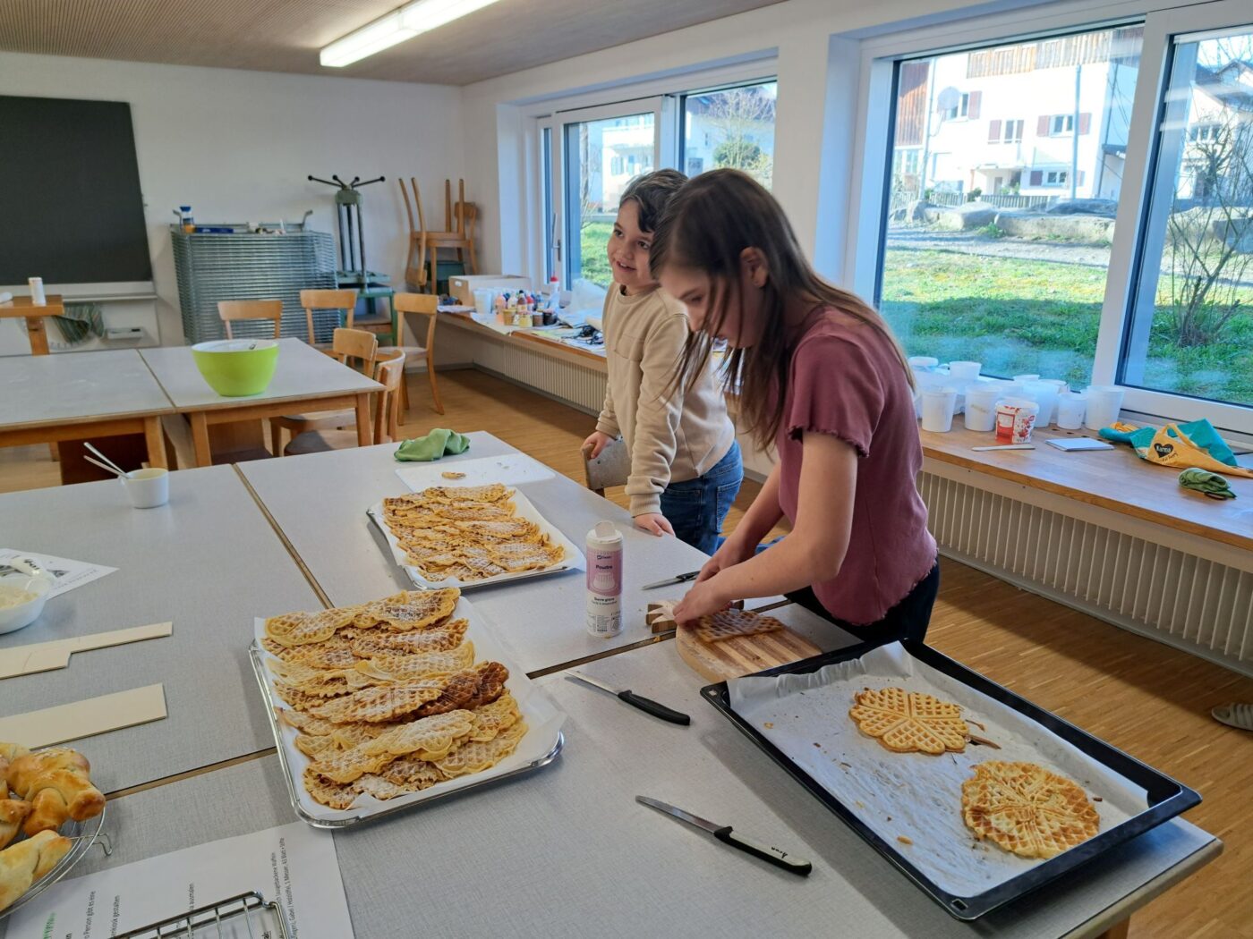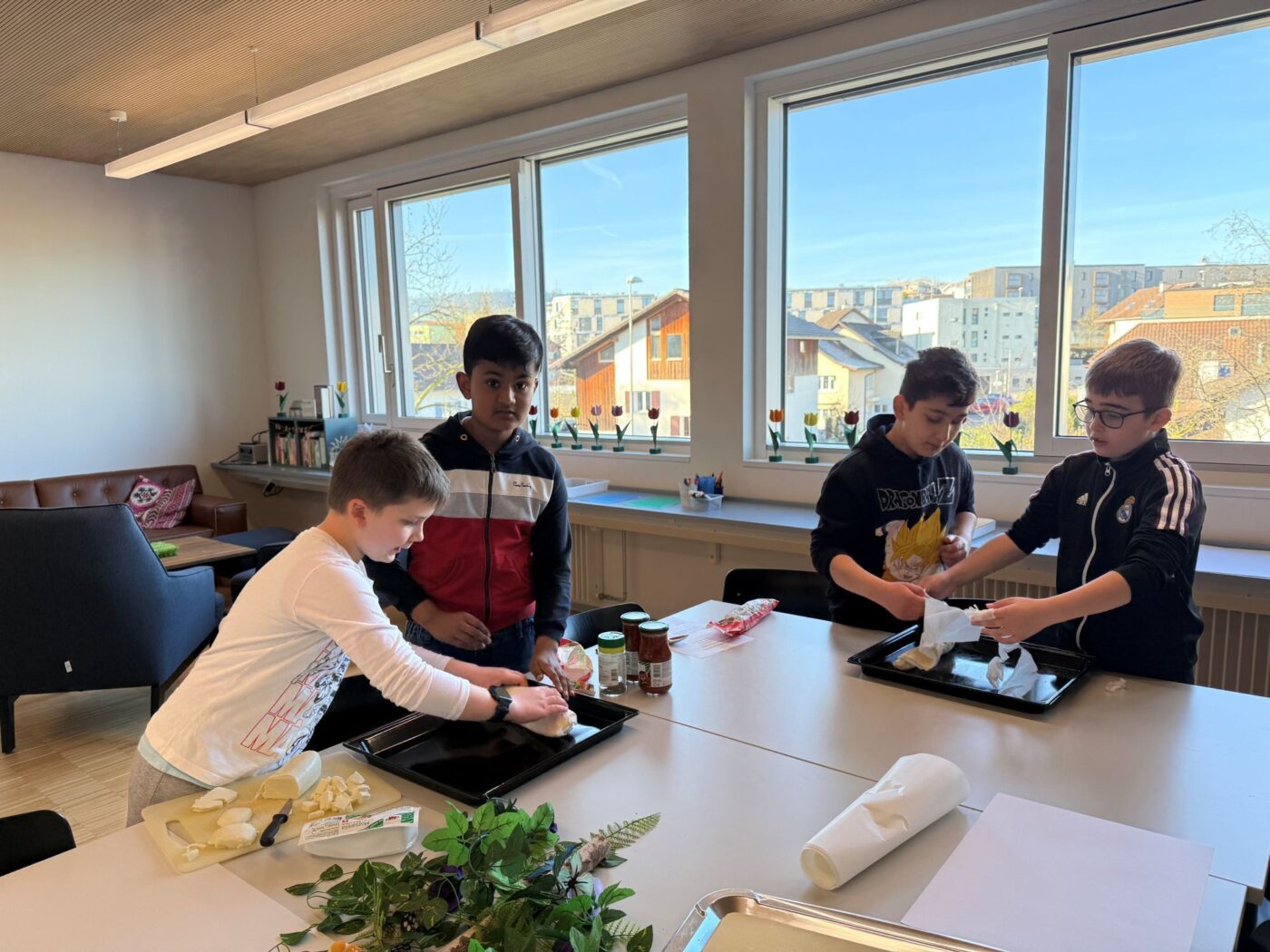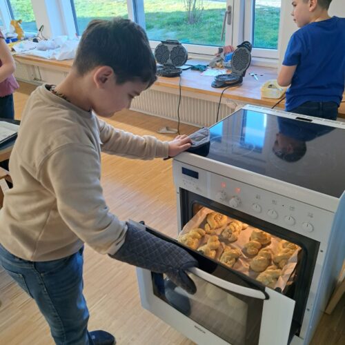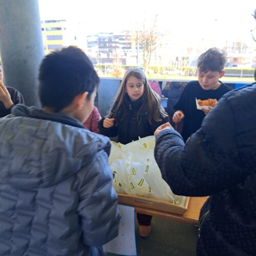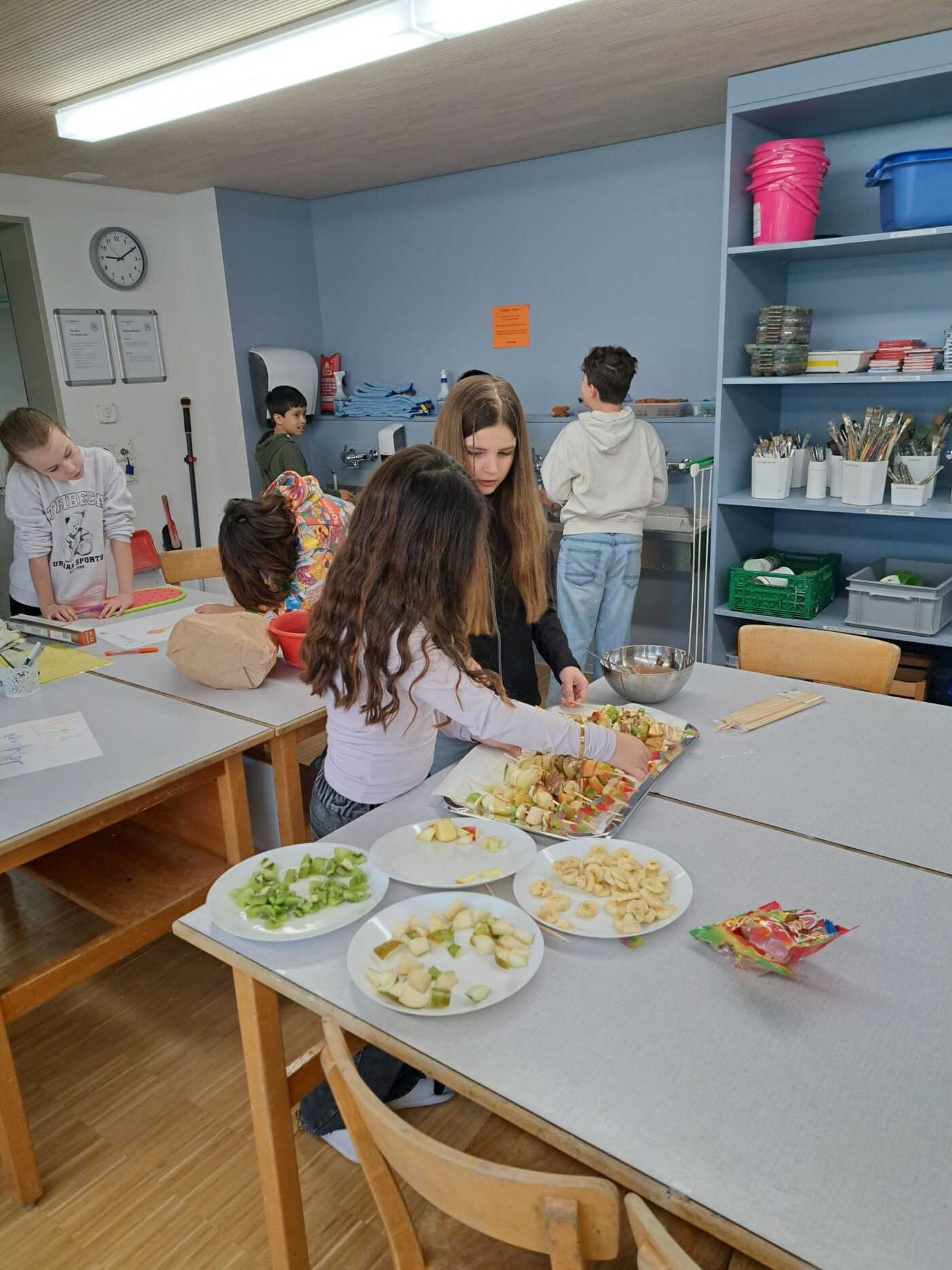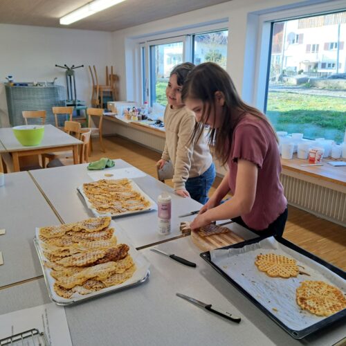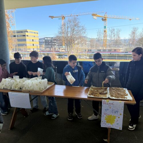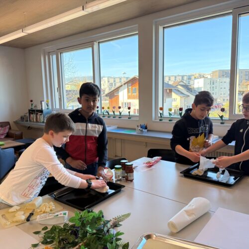 Nach dem gemeinsamen Diskutieren und Abstimmen in den beiden Klassen standen schlussendlich Pizza, Popcorn, saisonaler Früchtespiess mit wenig Schokolade und einem Gummibärli, Grittibänz/Osterhasen, Pommes (nicht frittiert), Punch/Sirup und Waffeln auf der Menükarte. Dann wurden Einkaufs- und Materiallisten erstellt, Bons ausgeschnitten, eingekauft und vorbereitet. Der Duft im ganzen Schulhaus liess die Vorfreude auf den Pausenkiosk steigern.