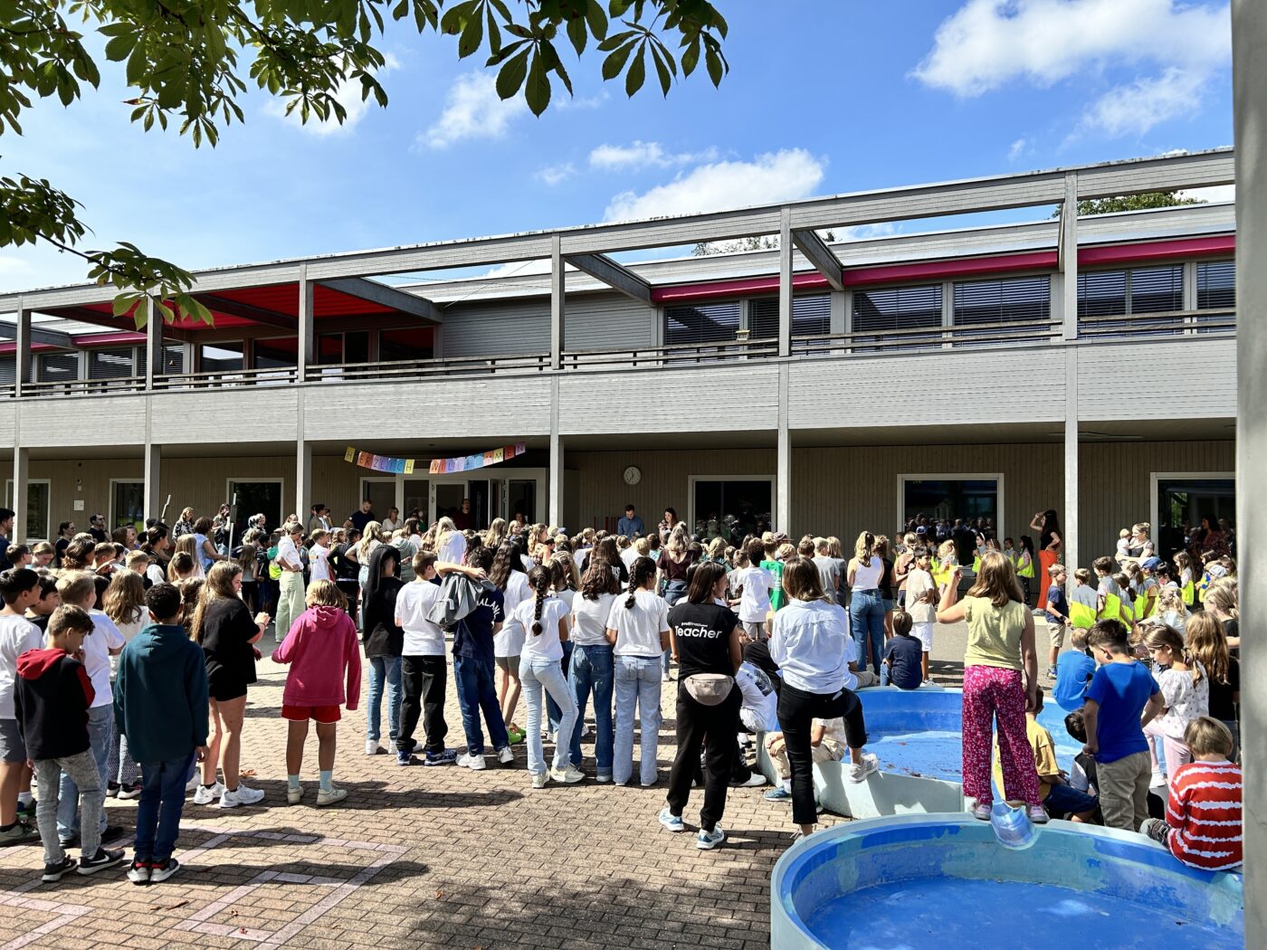 Kurz vor dem Mittag besammelten sich nochmals alle Primarschüler*innen auf dem Pausenplatz. Dort wurden sie von Schulleiterin Corinne Pfister herzlich begrüsst. Es wurde gemeinsam gesungen und die Schüler*innen konnten beim Schulhaustanz ihre tänzerischen Künste unter Beweis stellen. Danach wurden auch sie in die Mittagspause entlassen und hatten sich ihr Mittagessen mehr als verdient. Was für ein bewegter, schöner Start in das neue Schuljahr 2024-25.