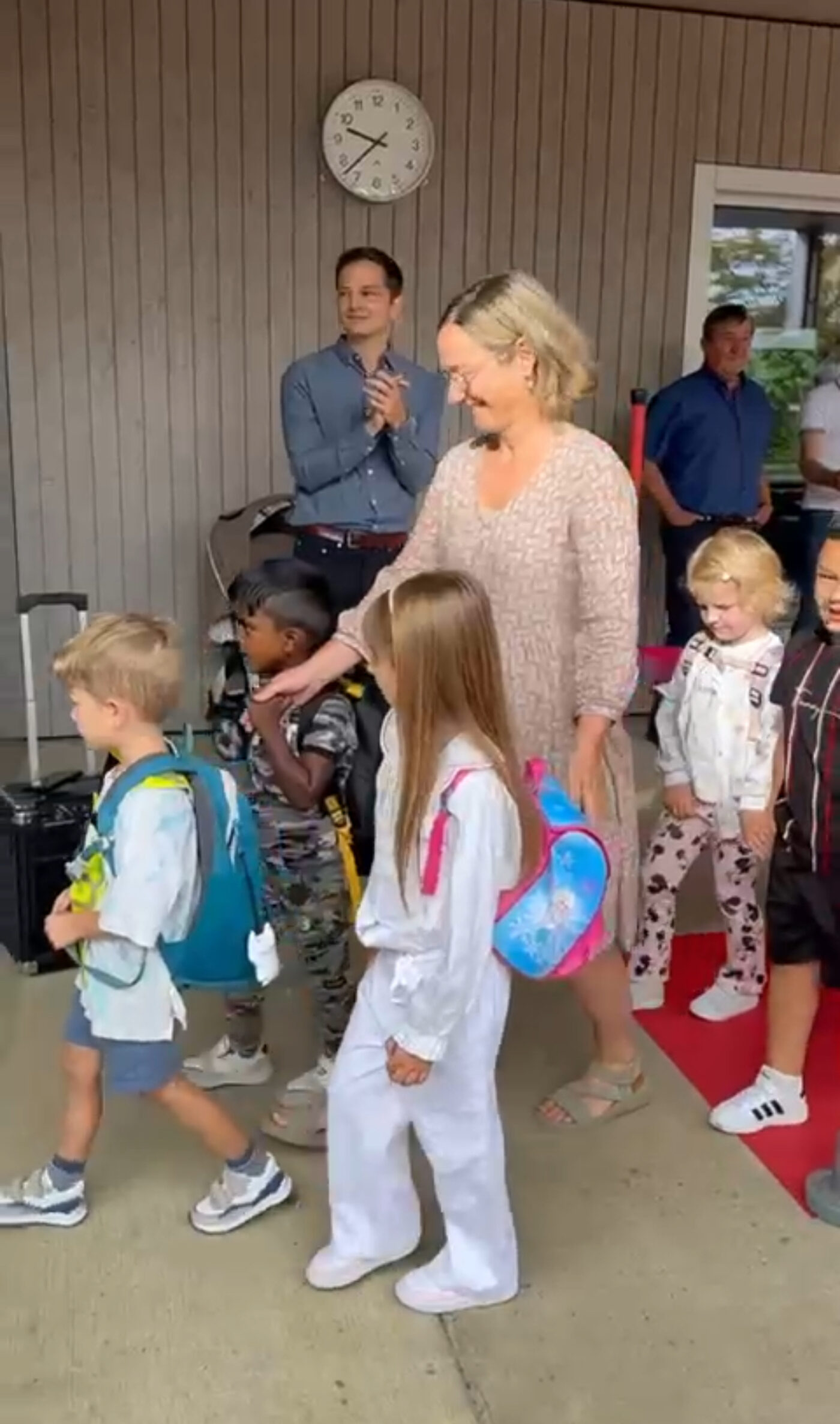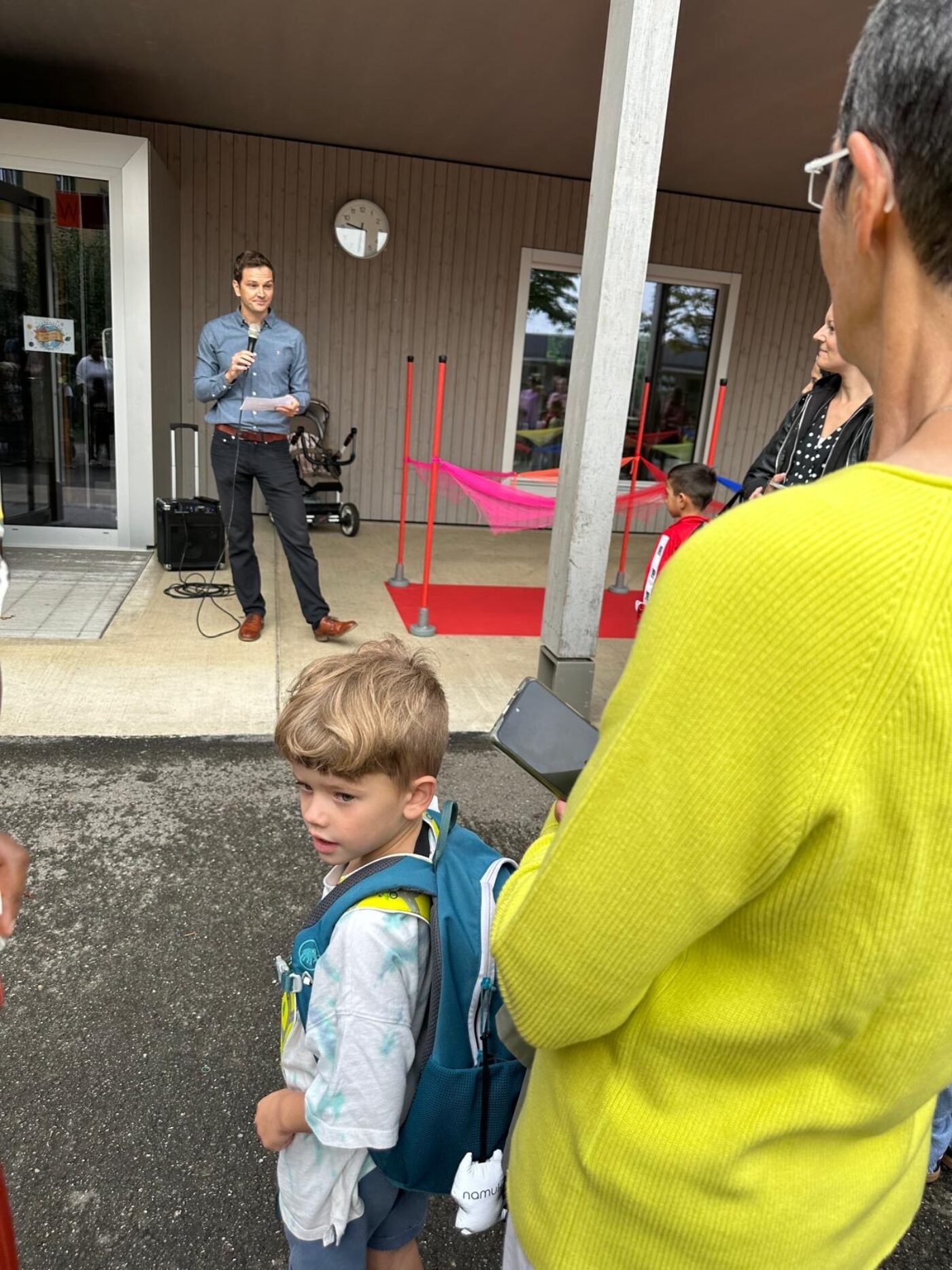 Kurze Zeit später begrüsste der Schulleiter Patrick Gämperle die Kindergartenkinder und ihre Eltern. Mit musikalischer Begleitung durften die Kinder über den roten Teppich ins Schulhaus marschieren, denn so wichtige Personen waren sie an diesem Tag. Es brauchte schon ein wenig Mut und auch das eine oder andere Tränchen wurde vergossen, jedoch meisterten sie diese Herausforderung tapfer.