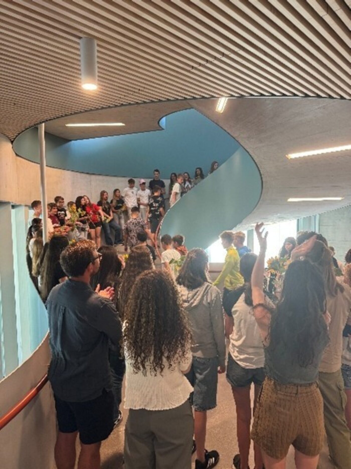 Ein besonderer Moment folgte um 9 Uhr: Die zweite und dritte Oberstufe bildeten auf der Wendeltreppe einen Spalier und hielten Sonnenblumen bereit. Unter Applaus gingen die neuen Schülerinnen und Schüler der ersten Oberstufe die Treppe hoch und wurden nochmals willkommen geheissen. Für die einen war es ein schöner Empfang, andere hätten sich in diesem Moment wohl am liebsten unsichtbar gemacht…unvergesslich war er aber sicher für alle. 😉