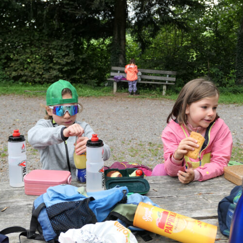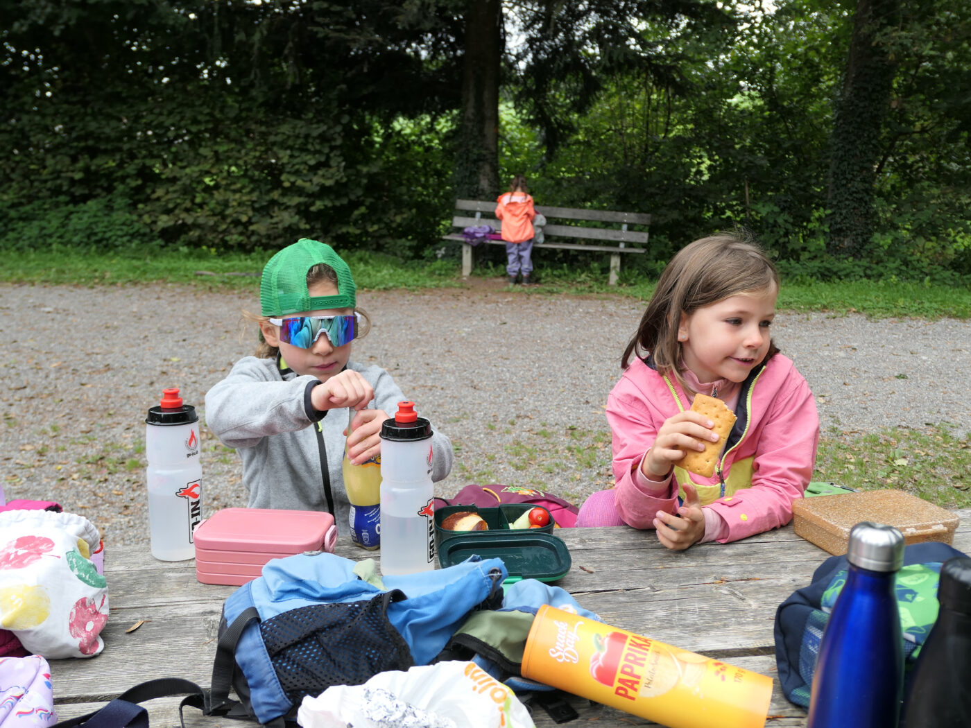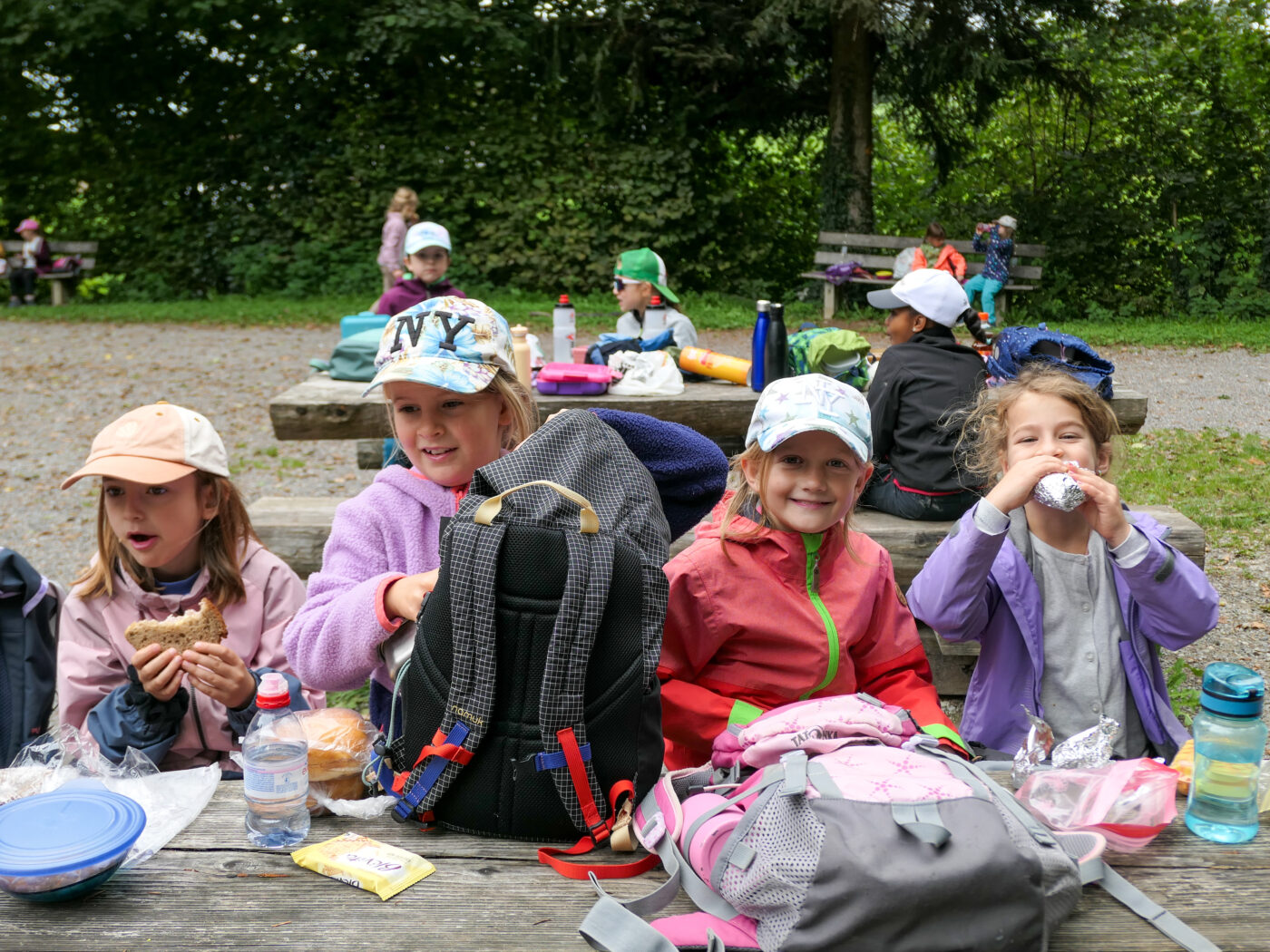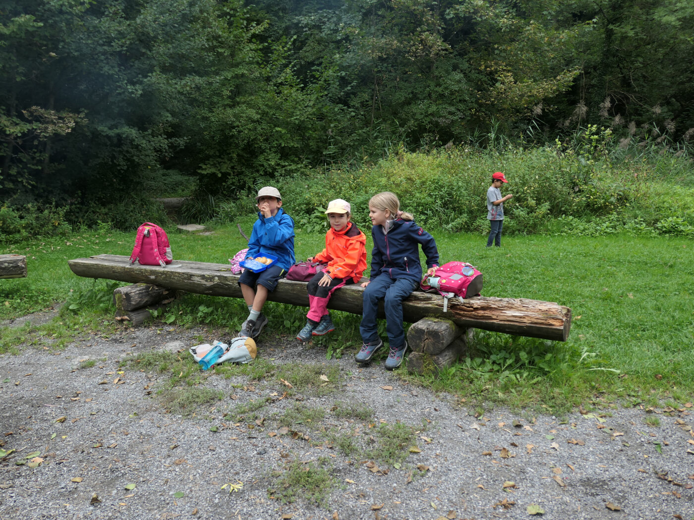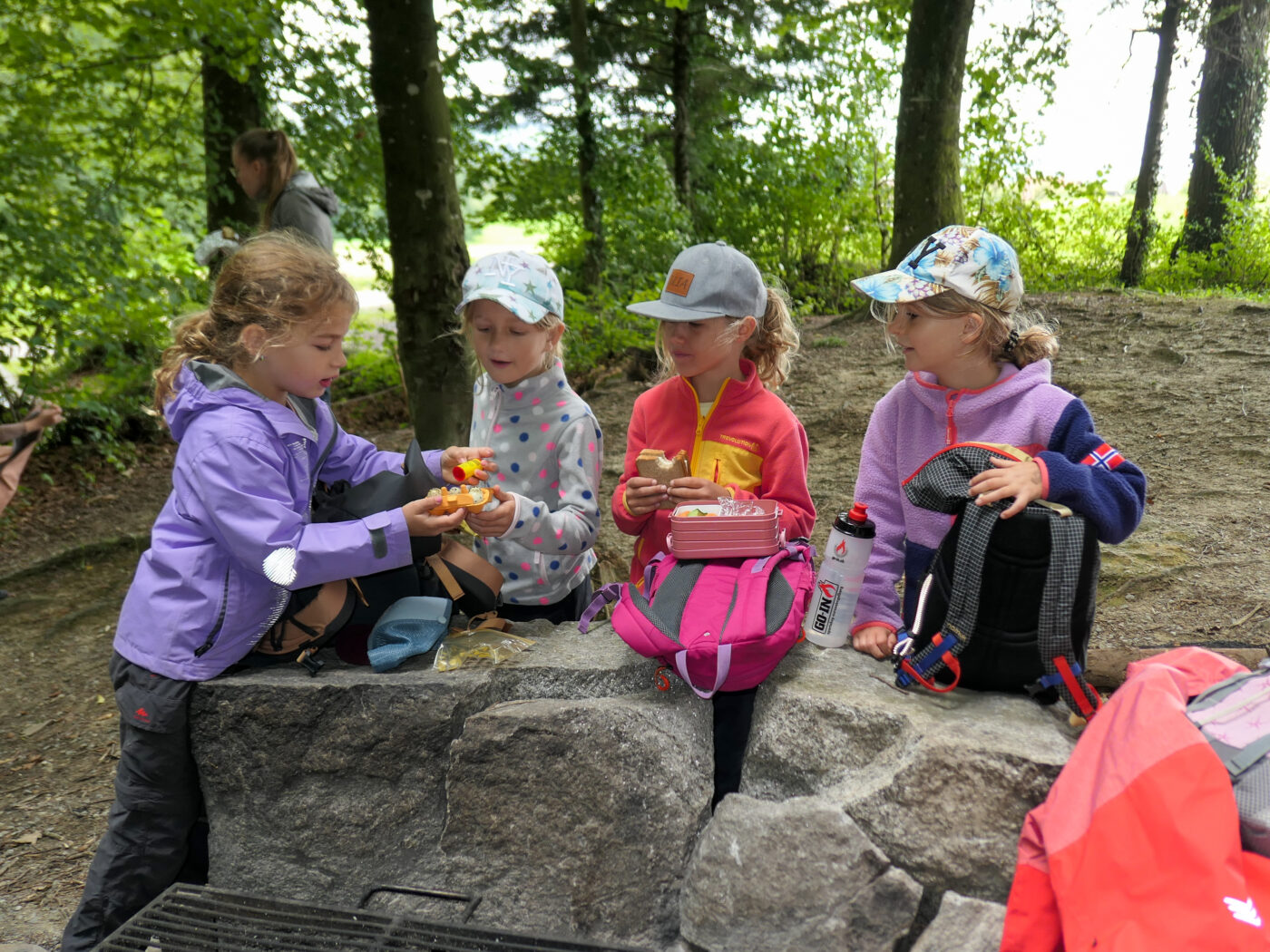 Der Weg führte ab Eich über den Glögglifroschweg und den Römerweg zum ersten Zwischenziel, dem Znüniplatz. Hier konnten sich die Kinder nach dem ersten Teil der Wanderung stärken und am Bach und im Wald spielen.