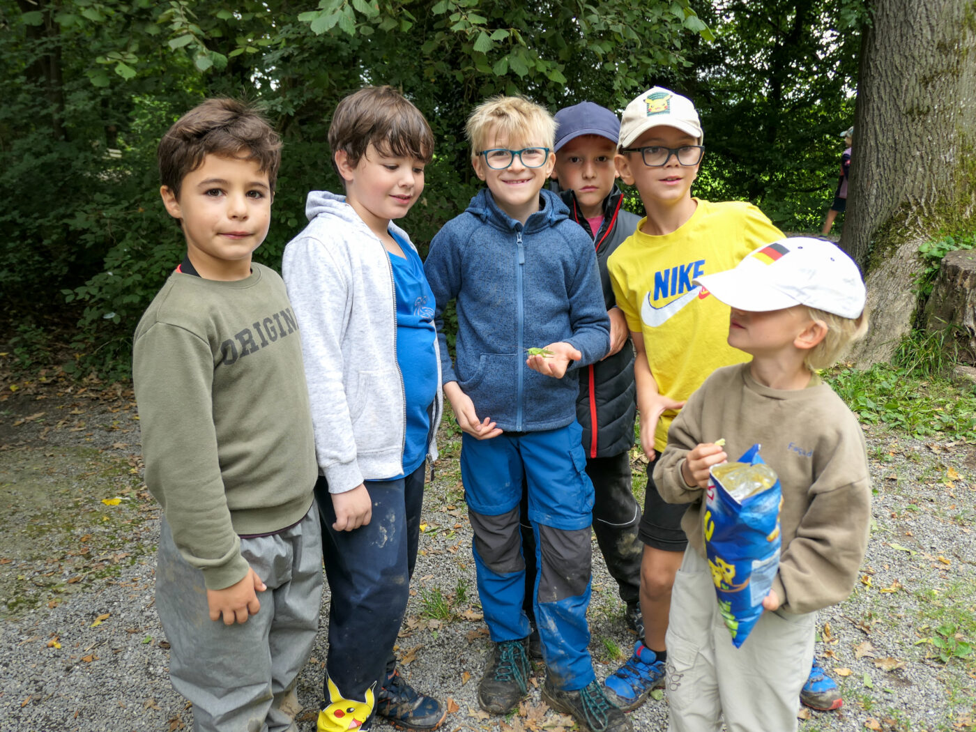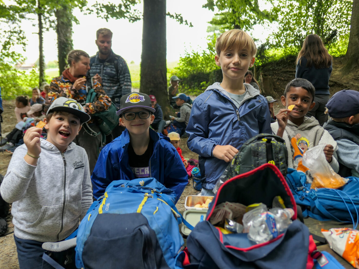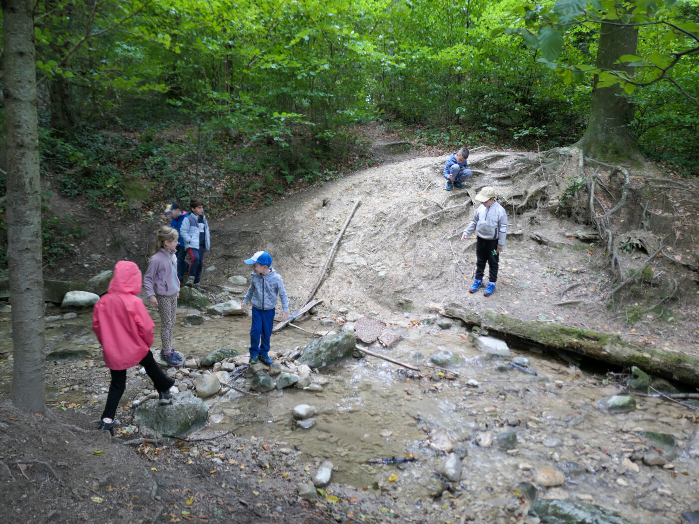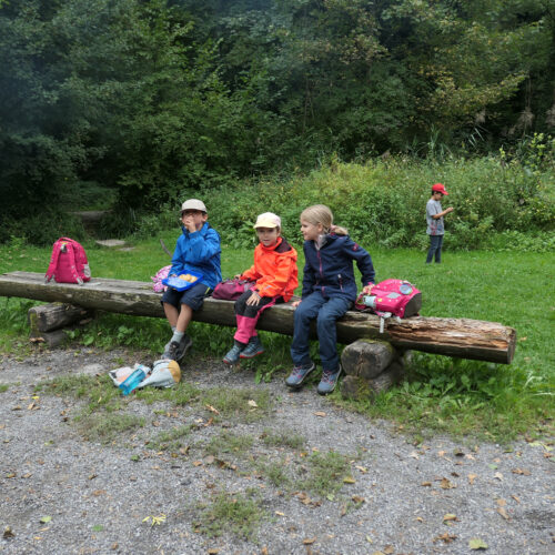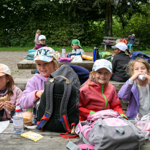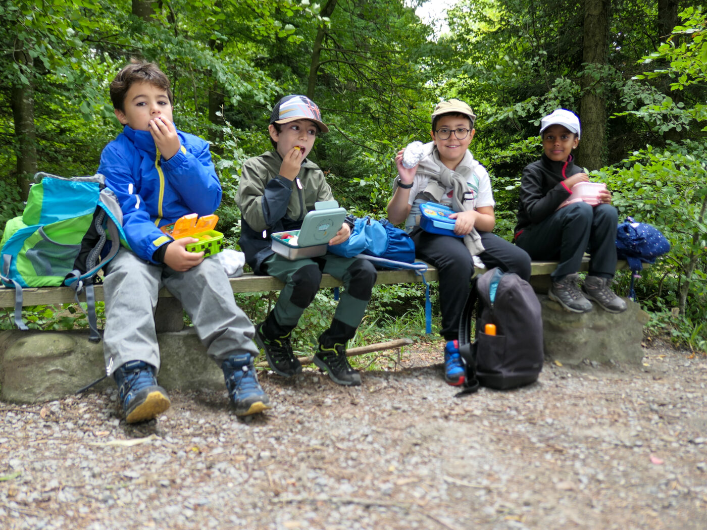 Der Weg führte ab Eich über den Glögglifroschweg und den Römerweg zum ersten Zwischenziel, dem Znüniplatz. Hier konnten sich die Kinder nach dem ersten Teil der Wanderung stärken und am Bach und im Wald spielen.