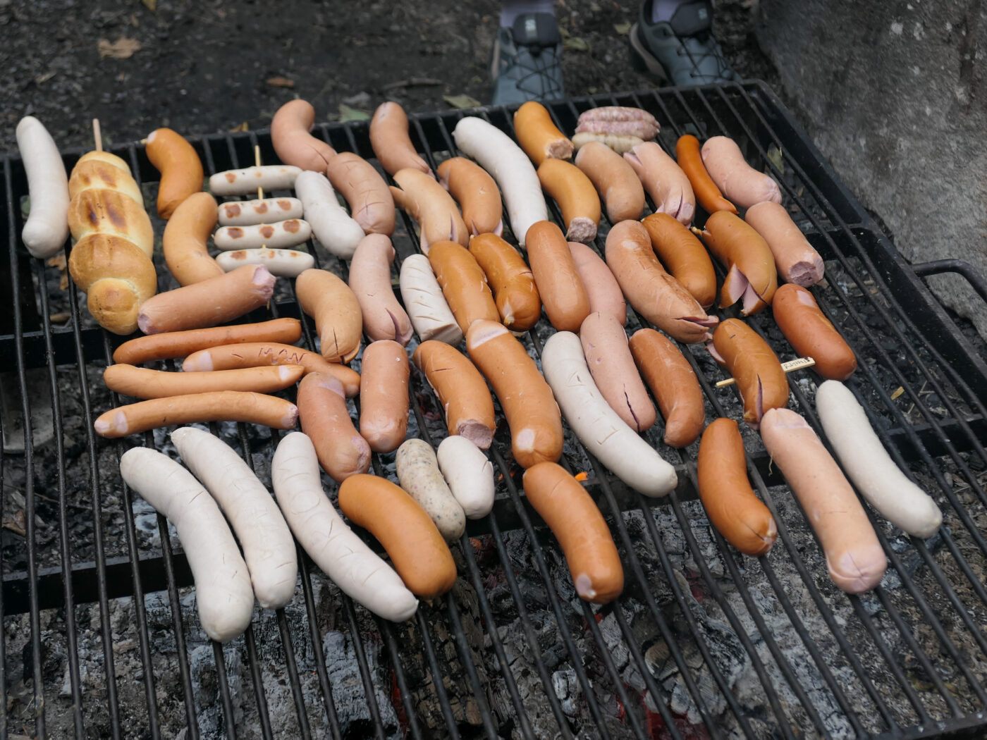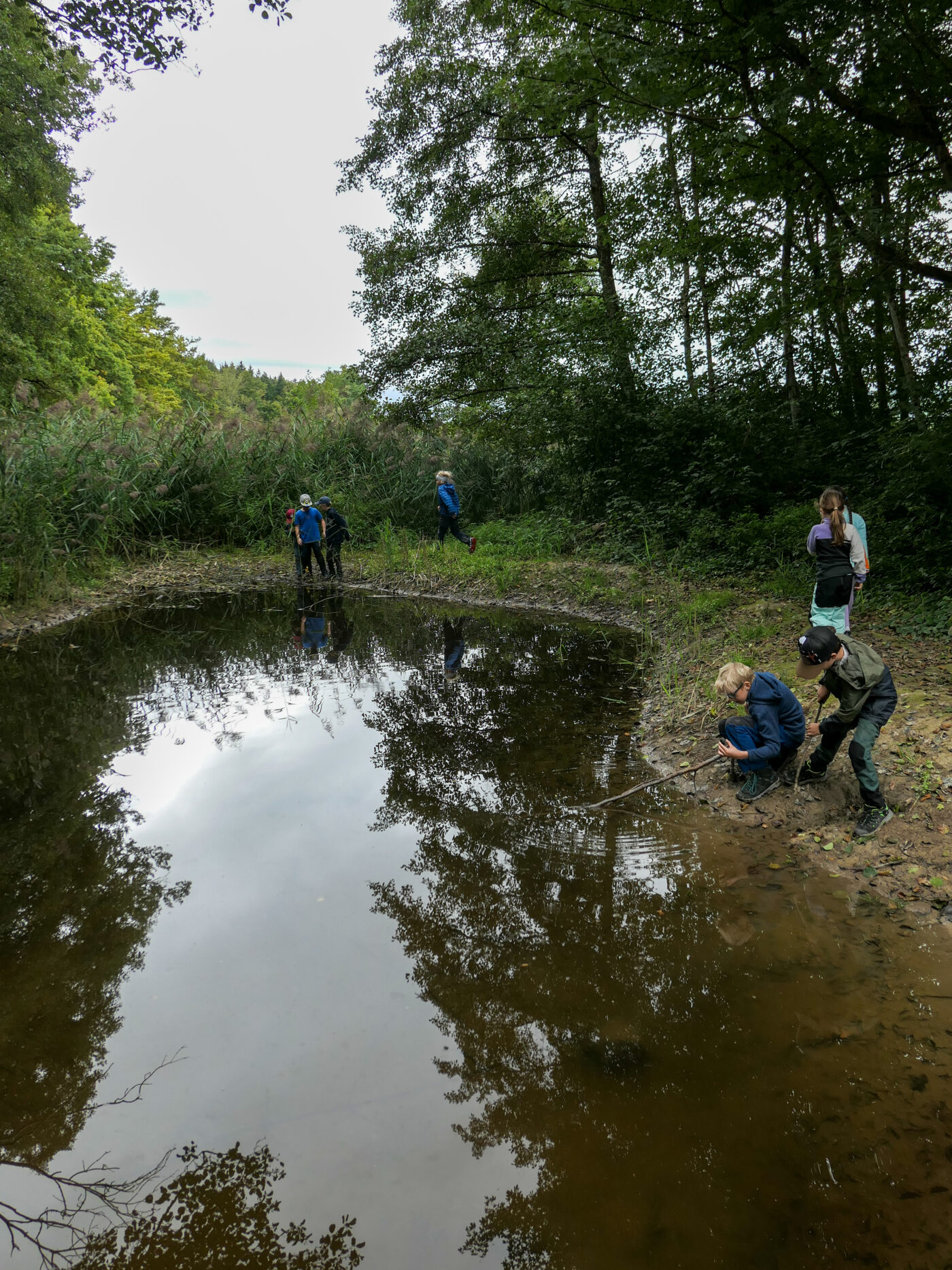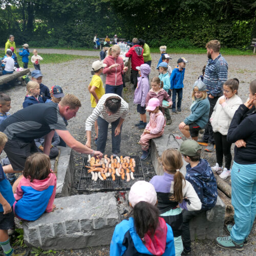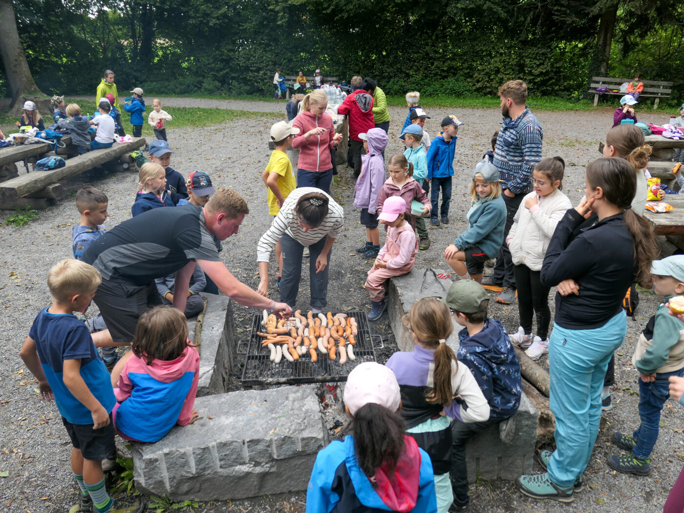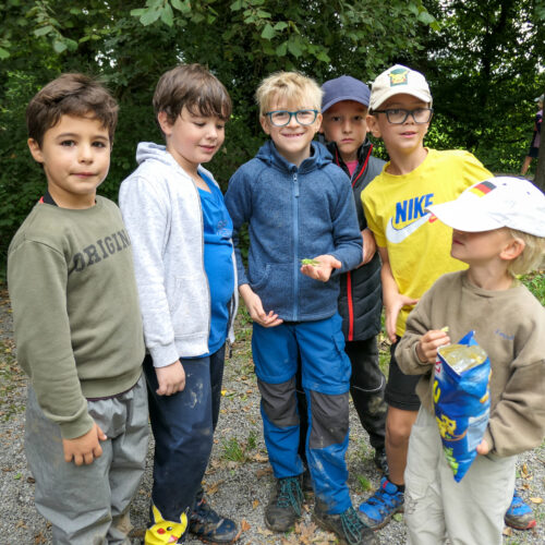 Nach einem weiteren kurzen Wegstück am Weiher angekommen, ging das Spielen gleich weiter. Die Kinder packten ihre Picknicks aus und viele brätelten am Feuer ihre mitgebrachte Wurst. Viele fanden kaum Zeit, diese zu verspeisen, da es soviel Interessantes im Wald zu entdecken gab. Frösche und Riesenheuschrecken wurden sogar gefunden!