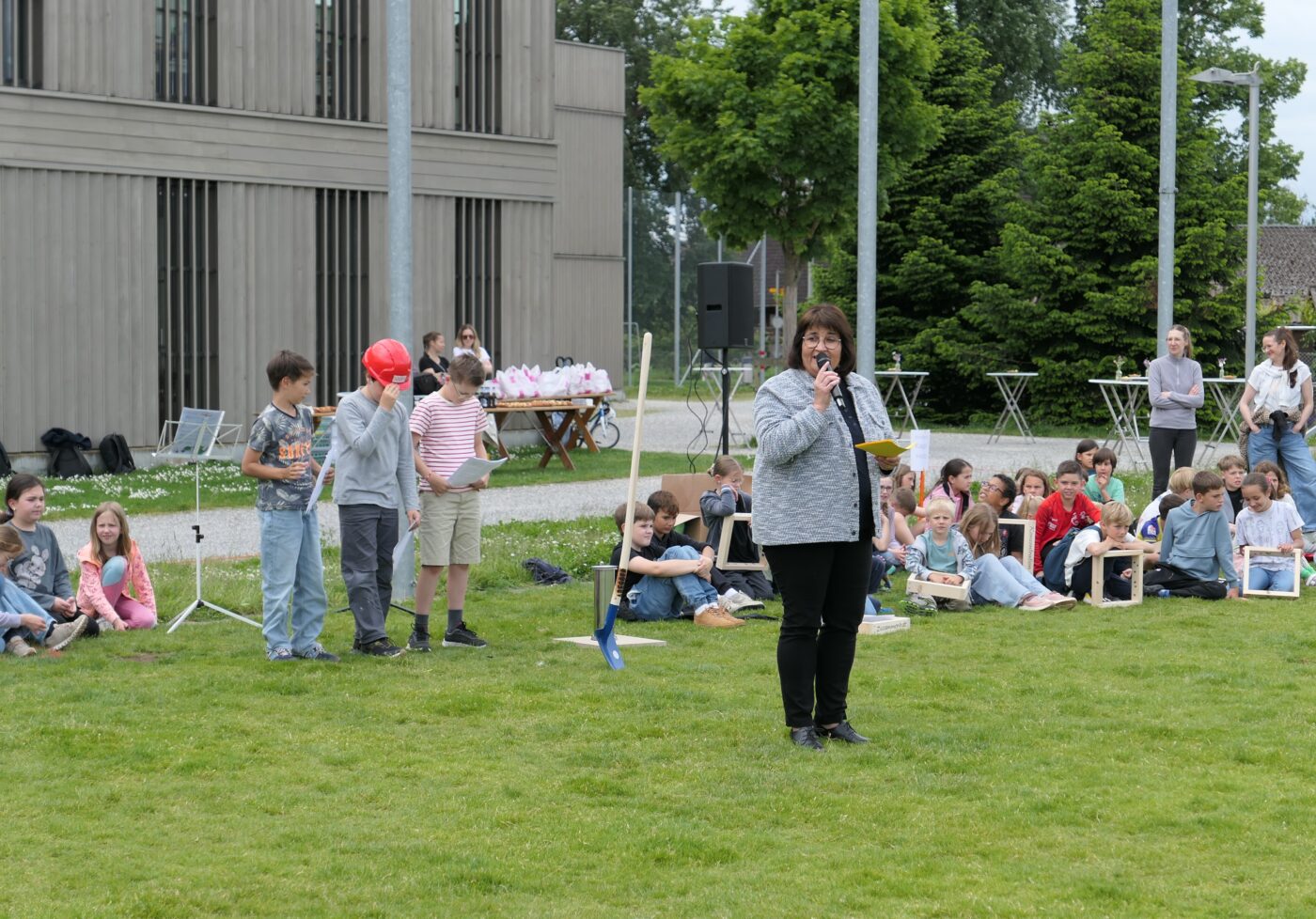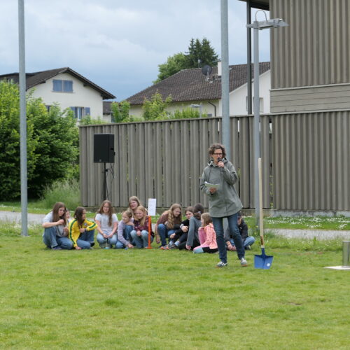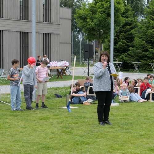 In ihren Ansprachen betonten die Rednerinnen und Redner die Bedeutung eines modernen Schulgebäudes für die Bildungslandschaft und die kommenden Generationen. Besonders stimmungsvoll gestaltete sich der Beitrag von Judith Studer, die die anwesenden Kinder aktiv in die Feier einbezog. Gemeinsam wurde das Geheimnis eines dicken Buches über den Schulhausbau gelüftet – darin fanden sich Begriffe wie Schulzimmer, Möblierung, WC’s, Strom und Wasser – alles Dinge, die für einen reibungslosen Schulbetrieb unerlässlich sind.