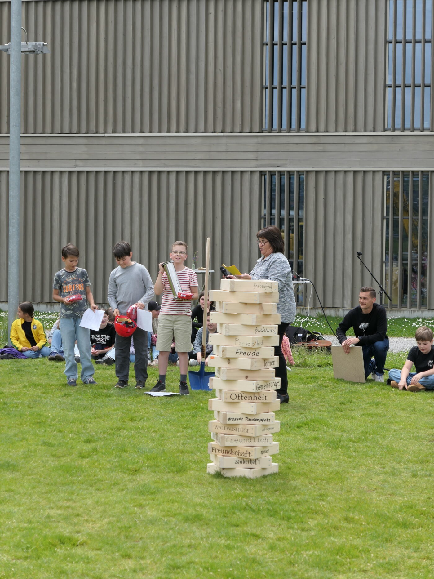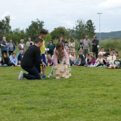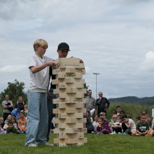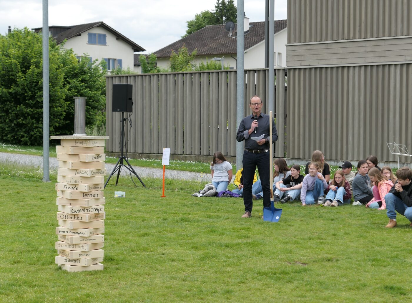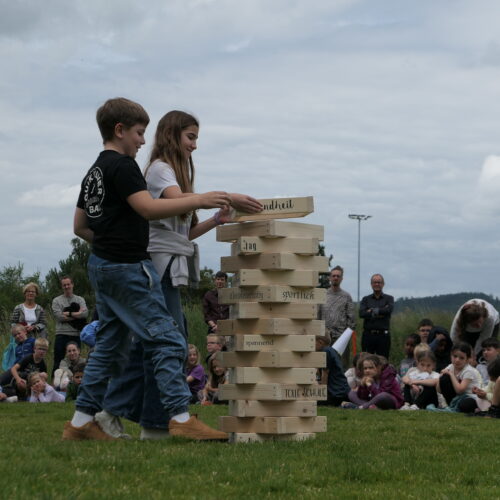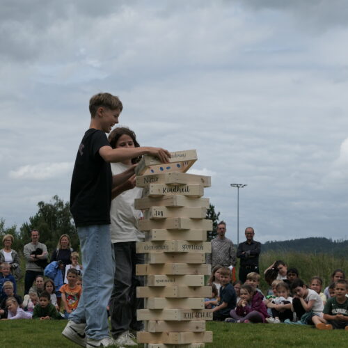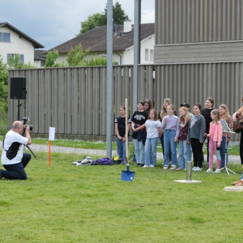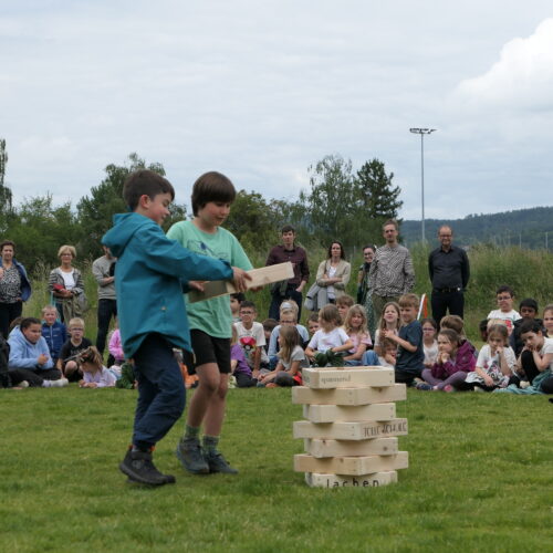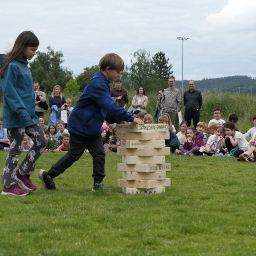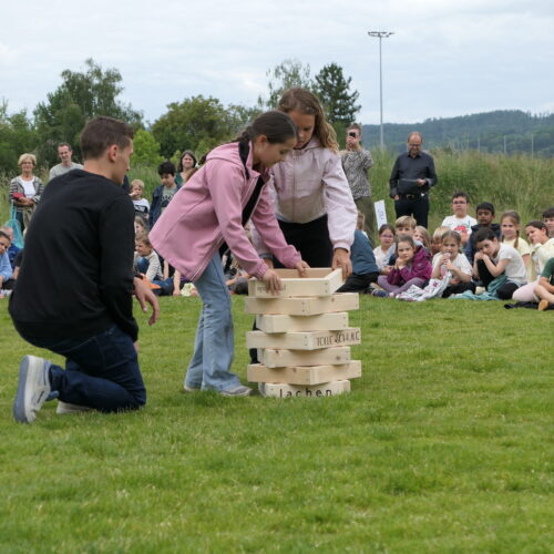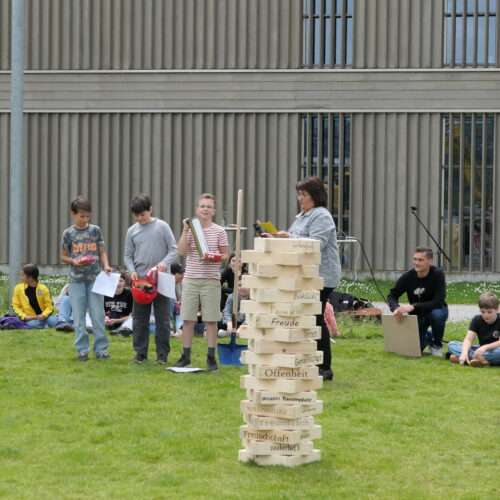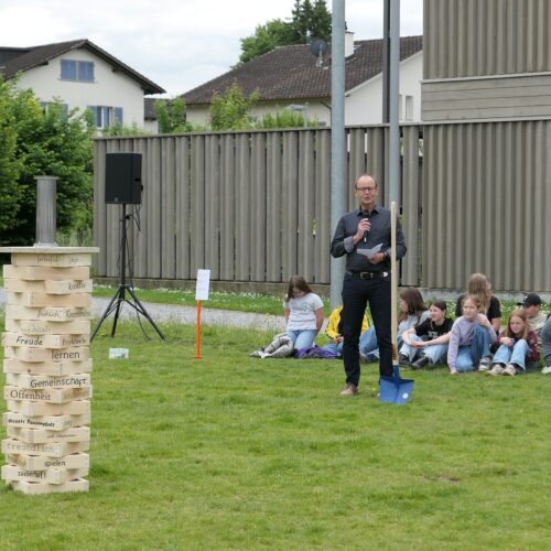 Musikalisch wurde der Anlass vom Schulchor PopChorn umrahmt, der mit seinen Darbietungen für festliche Atmosphäre sorgte. Ein weiterer Höhepunkt war der symbolische Turm, der aus Rahmen aus Kapla-Hölzern errichtet wurde. Jede Klasse hatte im Vorfeld einen solchen Rahmen gestaltet und mit Begriffen versehen, die für sie das Schulleben ausmachen. Begriffe wie spannend, lustig, grosser Pausenplatz, Herbstwanderung oder Natur zeugten von der Vielfalt und Lebendigkeit des Schulalltags.
