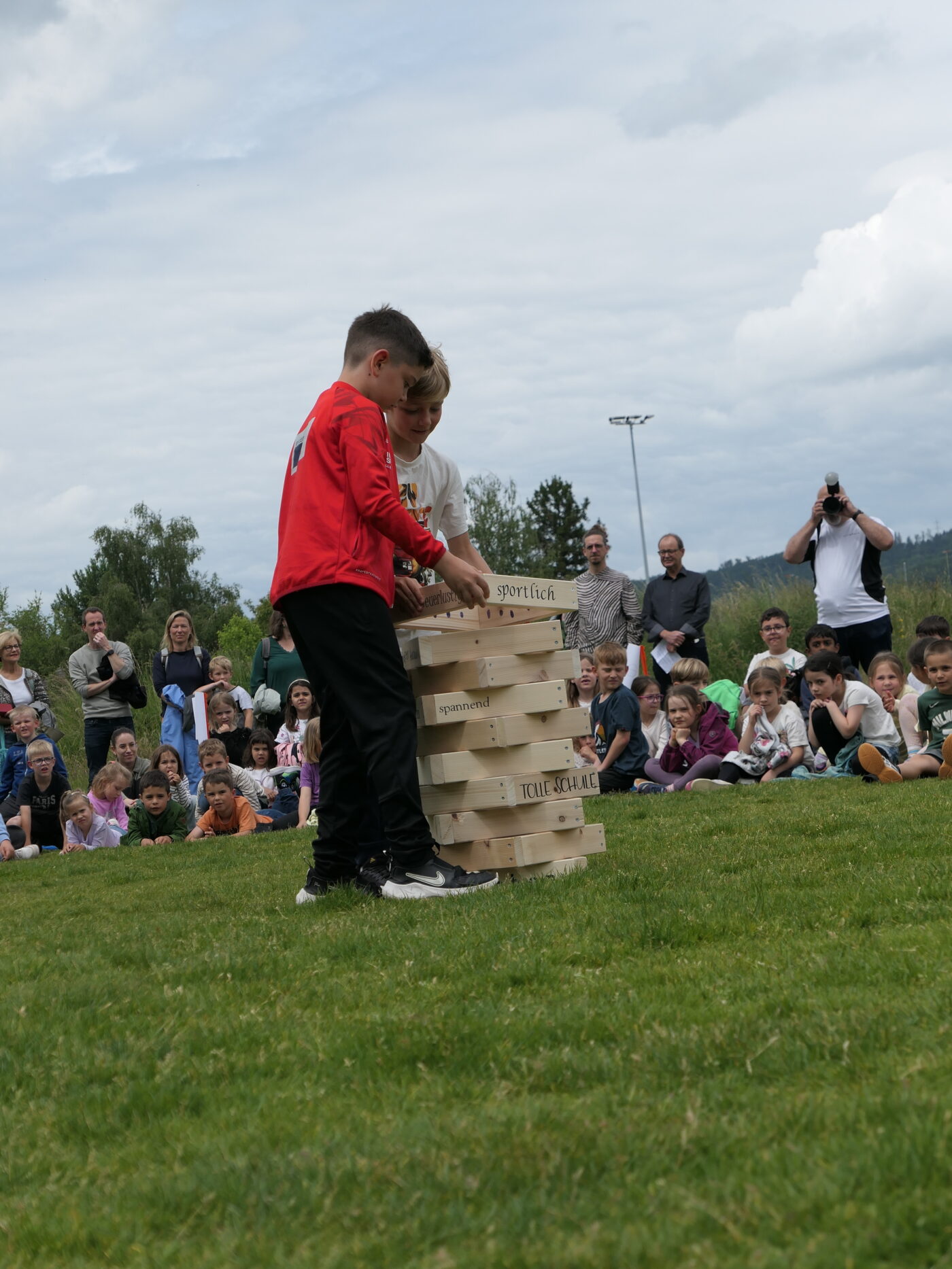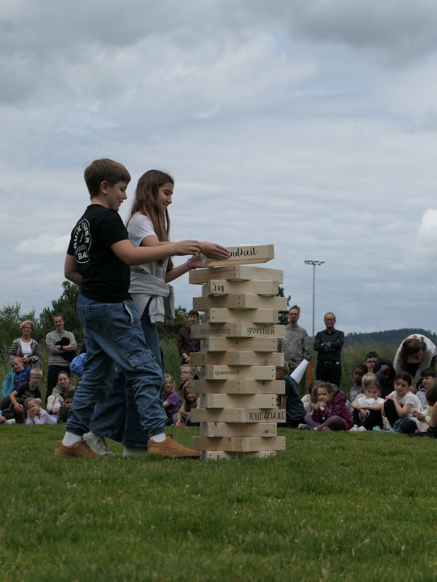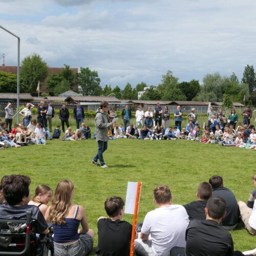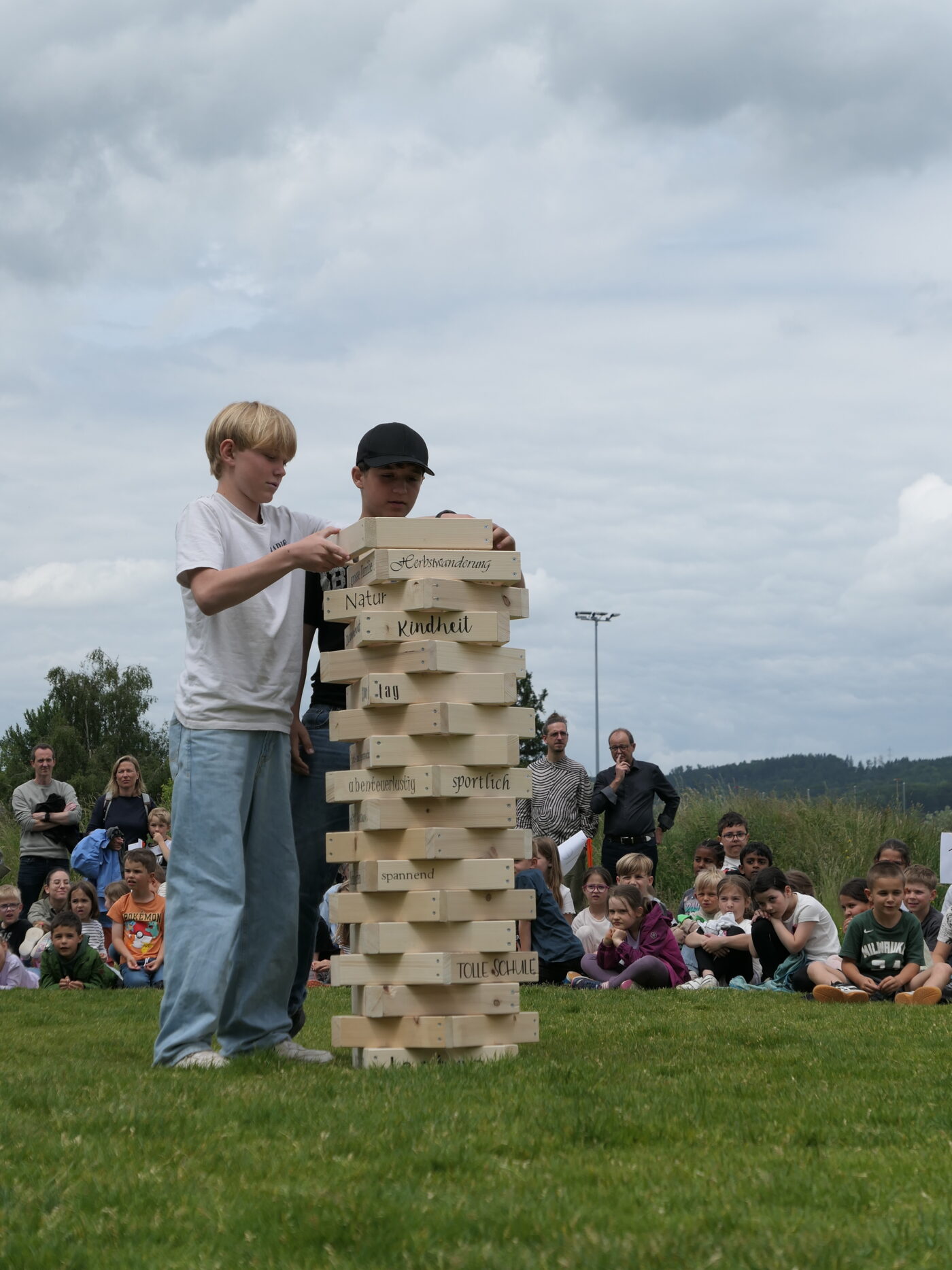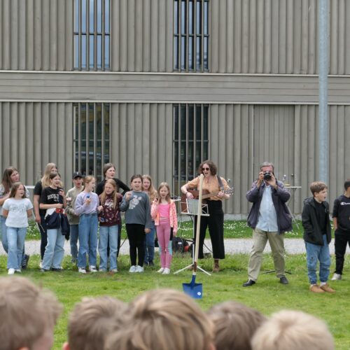 Musikalisch wurde der Anlass vom Schulchor PopChorn umrahmt, der mit seinen Darbietungen für festliche Atmosphäre sorgte. Ein weiterer Höhepunkt war der symbolische Turm, der aus Rahmen aus Kapla-Hölzern errichtet wurde. Jede Klasse hatte im Vorfeld einen solchen Rahmen gestaltet und mit Begriffen versehen, die für sie das Schulleben ausmachen. Begriffe wie spannend, lustig, grosser Pausenplatz, Herbstwanderung oder Natur zeugten von der Vielfalt und Lebendigkeit des Schulalltags.
