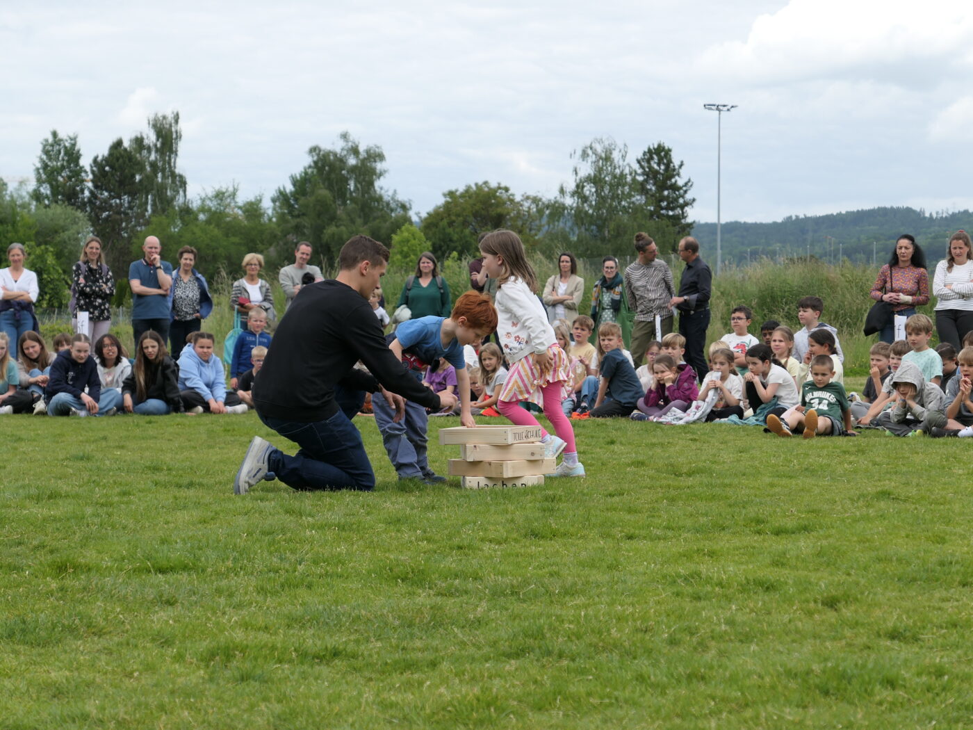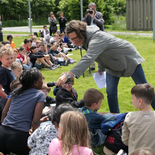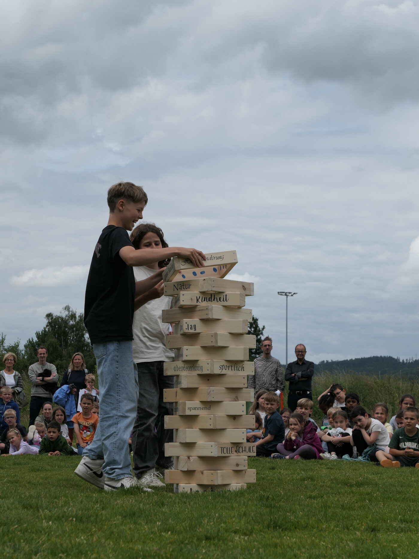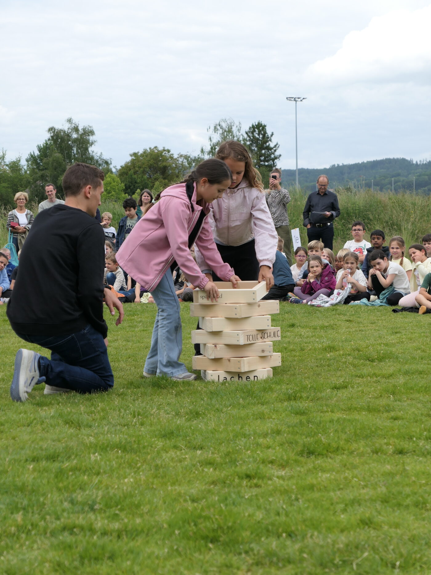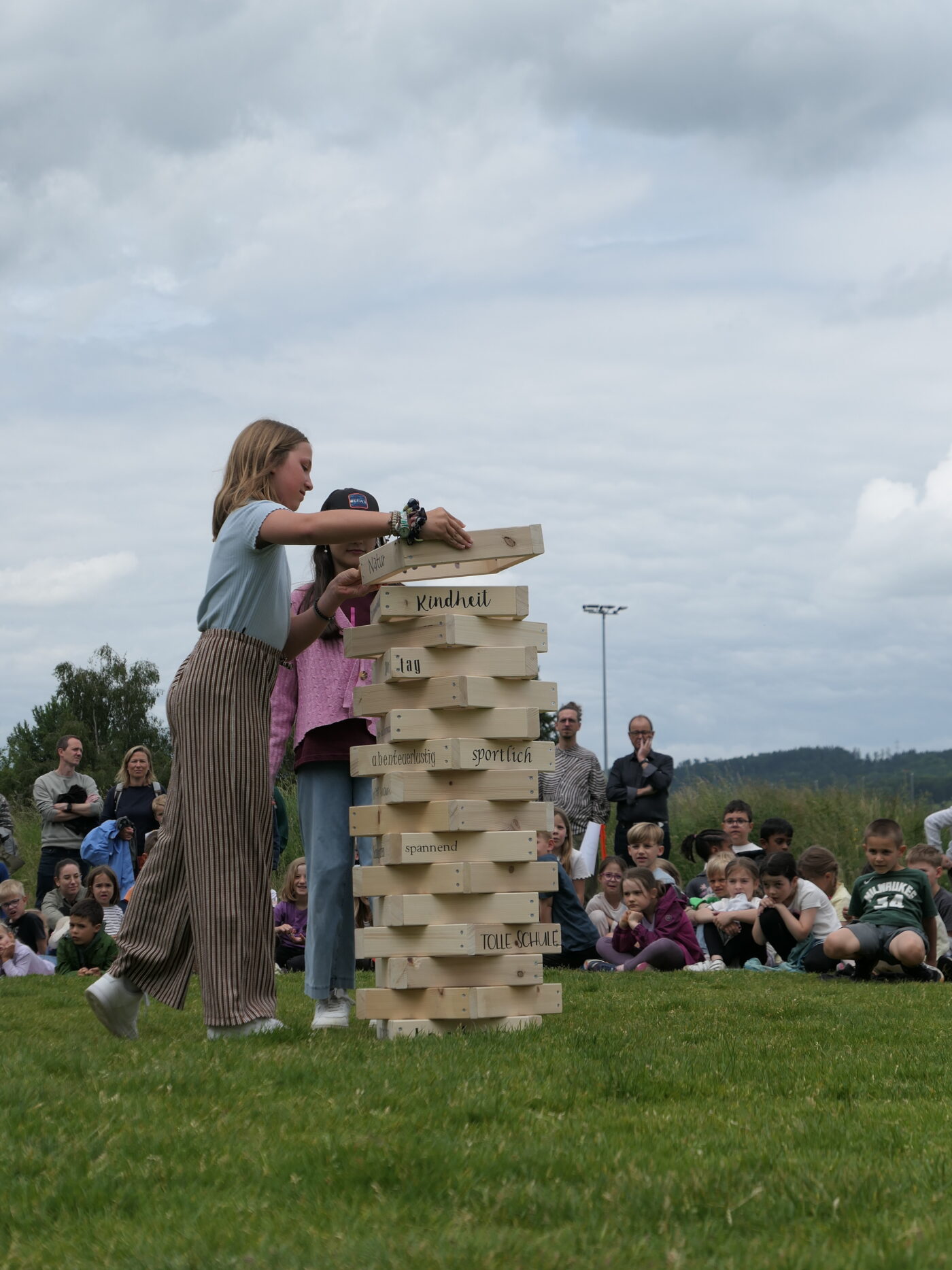 Musikalisch wurde der Anlass vom Schulchor PopChorn umrahmt, der mit seinen Darbietungen für festliche Atmosphäre sorgte. Ein weiterer Höhepunkt war der symbolische Turm, der aus Rahmen aus Kapla-Hölzern errichtet wurde. Jede Klasse hatte im Vorfeld einen solchen Rahmen gestaltet und mit Begriffen versehen, die für sie das Schulleben ausmachen. Begriffe wie spannend, lustig, grosser Pausenplatz, Herbstwanderung oder Natur zeugten von der Vielfalt und Lebendigkeit des Schulalltags.