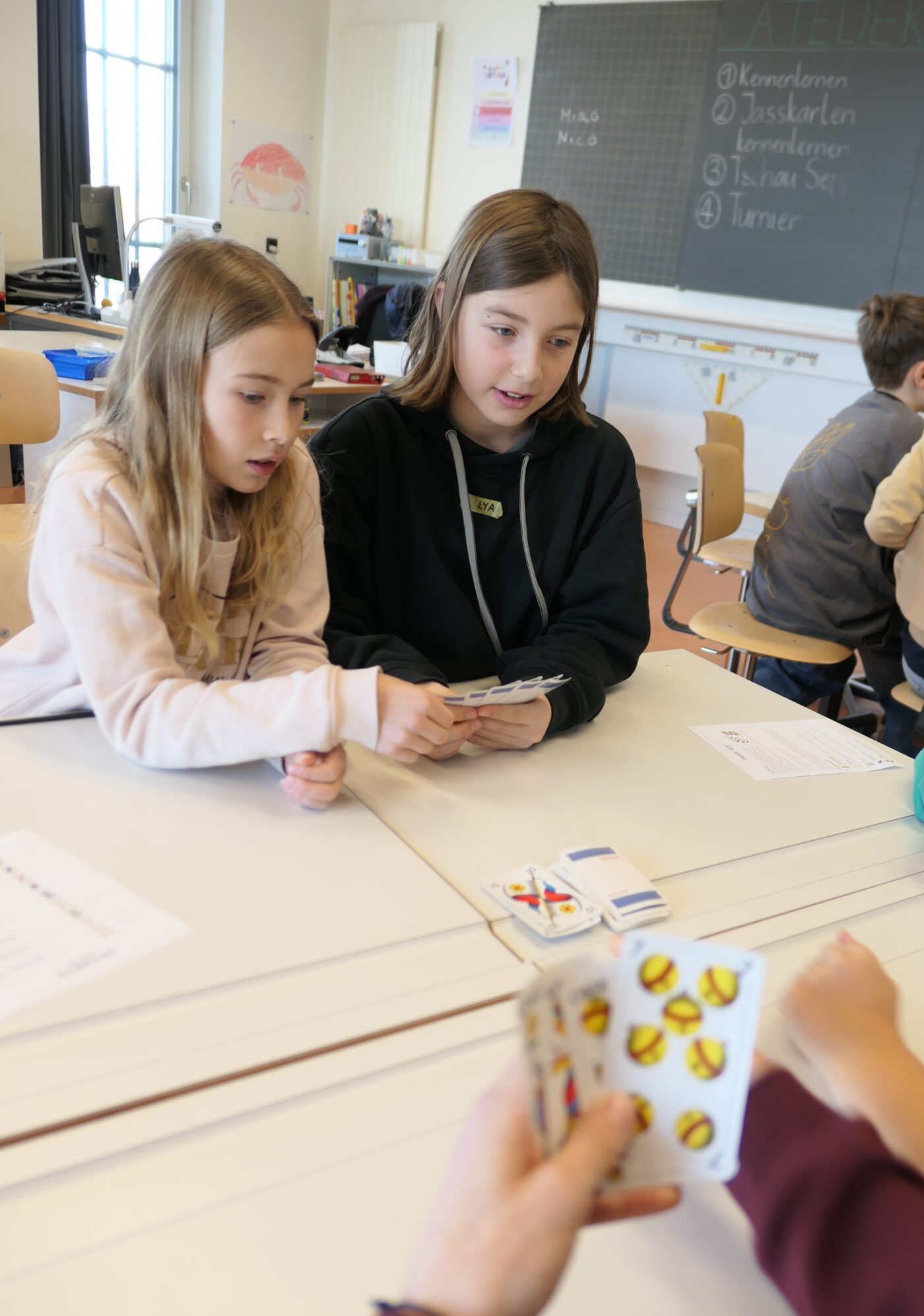 Besonders schön war zu beobachten, wie sich die Kinder in den verschiedenen Ateliers gegenseitig unterstützten. Während einige in bestimmten Bereichen ihre Stärken einbringen konnten, waren andere in anderen Ateliers besonders geschickt – so lernten die Kinder voneinander und miteinander. Beim Kartenspiel „Tschau Sepp“ setzten sich die Schülerinnen und Schüler zudem mit den Deutschschweizer Jasskarten auseinander, deren Kenntnis heute nicht mehr für alle selbstverständlich ist.
