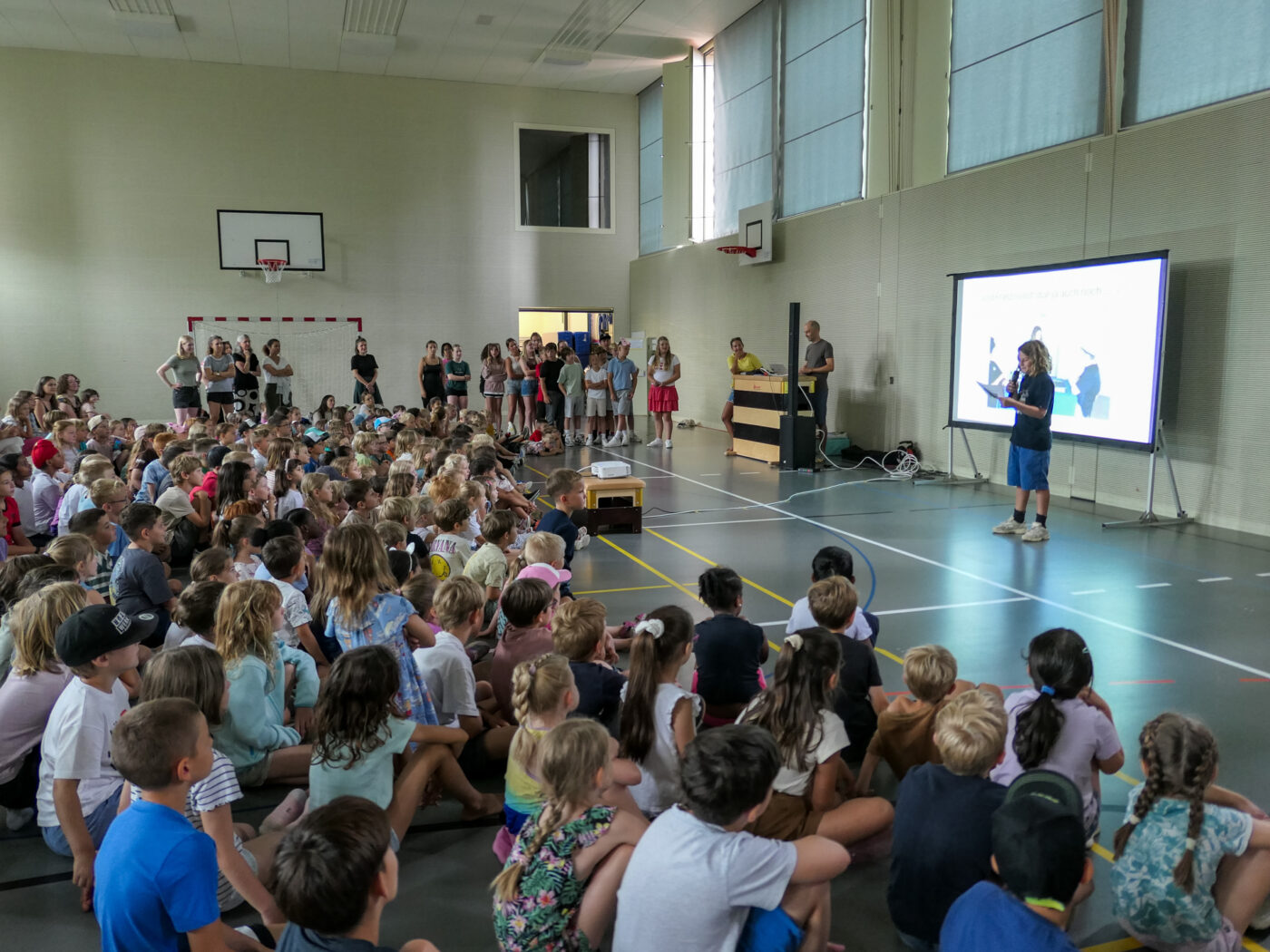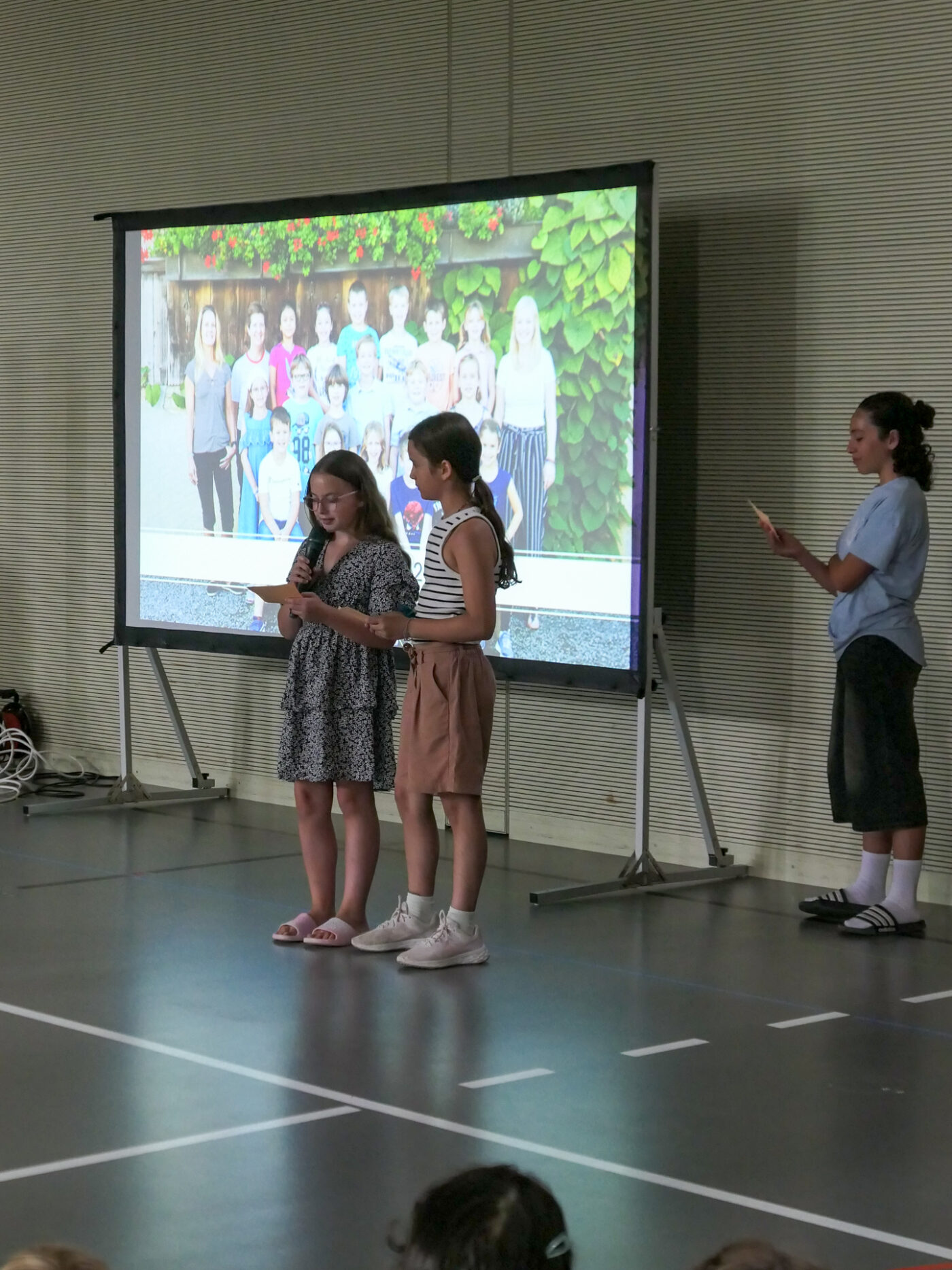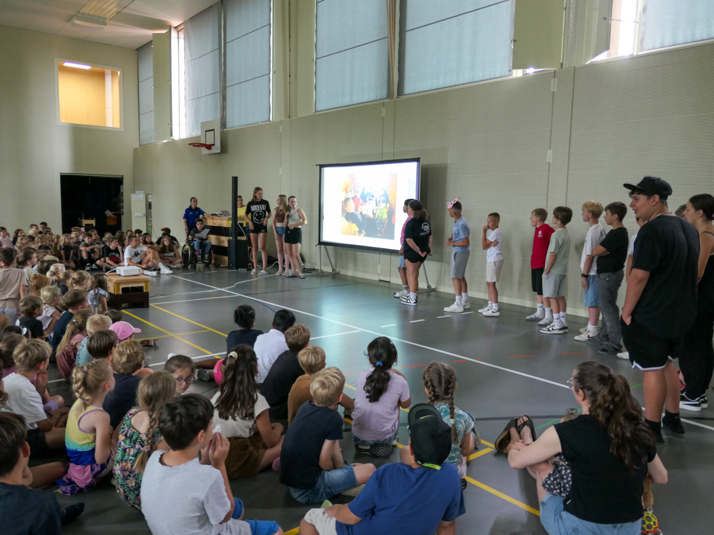 Zum Abschluss des Schuljahres präsentierten uns die beiden 6. Klassen die Highlights ihrer Primarschulzeit und vom Klassenlager. Von den 5. Klässlern bekamen sie ein Zauberkarten-Set mit auf den Weg. An der Feier wurde auch unser Zivi, Darko Mladenovic, verabschiedet. Die beiden Klassenlehrpersonen der 6. Klasse erhielten ein Abschiedsgeschenk von ihren Klassen, und auch der Schulhausabwart Lukas Furrer ging nicht leer aus. Am Ende der Feier verliessen alle die Turnhalle in einer Polonaise.