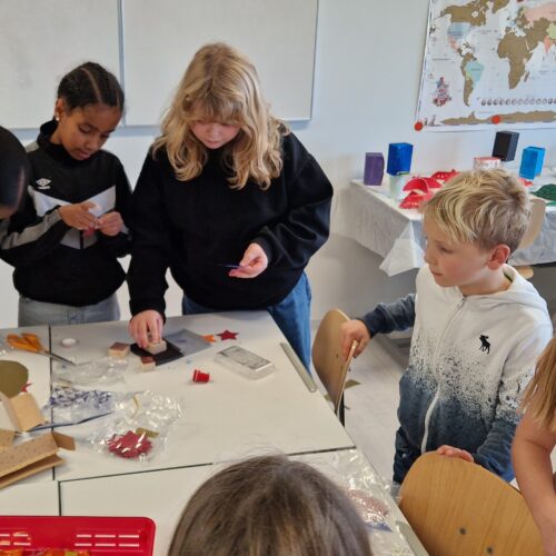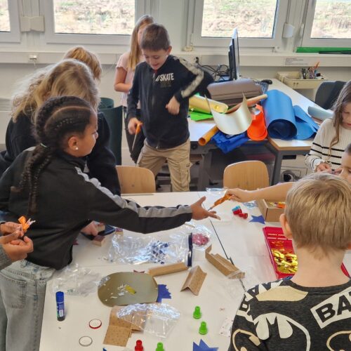 In klassenübergreifenden Gruppen entstanden festliche Girlanden für die Gänge im Palast. Die Kinder der Mittelstufe bastelten einen Nachmittag lang dekorative Girlanden und lernten dabei das eine oder andere noch unbekannte Kind aus einer anderen Klasse kennen. Nun glänzt und glitzert es im Palast, und die Deko erinnert an den gelungenen Bastelnachmittag.