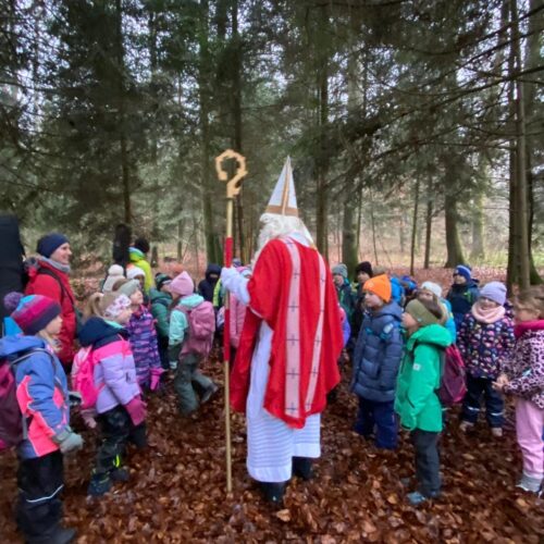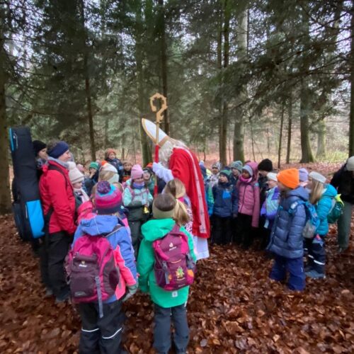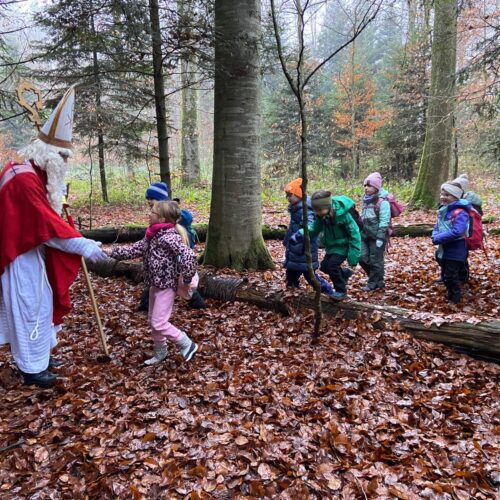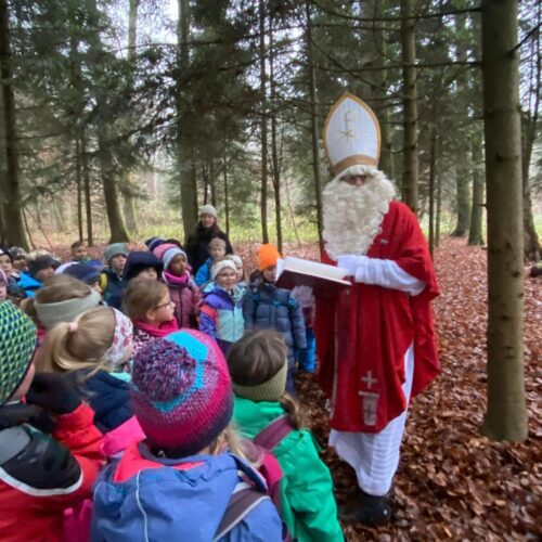 Mit grosser Aufregung und Vorfreude machten sich die 1./2.-Klässler auf den Weg in den Wald, um den Samichlaus zu treffen. Im Haselwartwald sangen sie zunächst ein Weihnachtslied. Danach durfte jeweils eine Gruppe von Kindern zum Samichlaus, der ihnen eine stimmungsvolle Geschichte vorlas. Währenddessen genossen die anderen Kinder ihr Znüni und spielten im Wald, bevor auch sie den Samichlaus besuchen konnten.