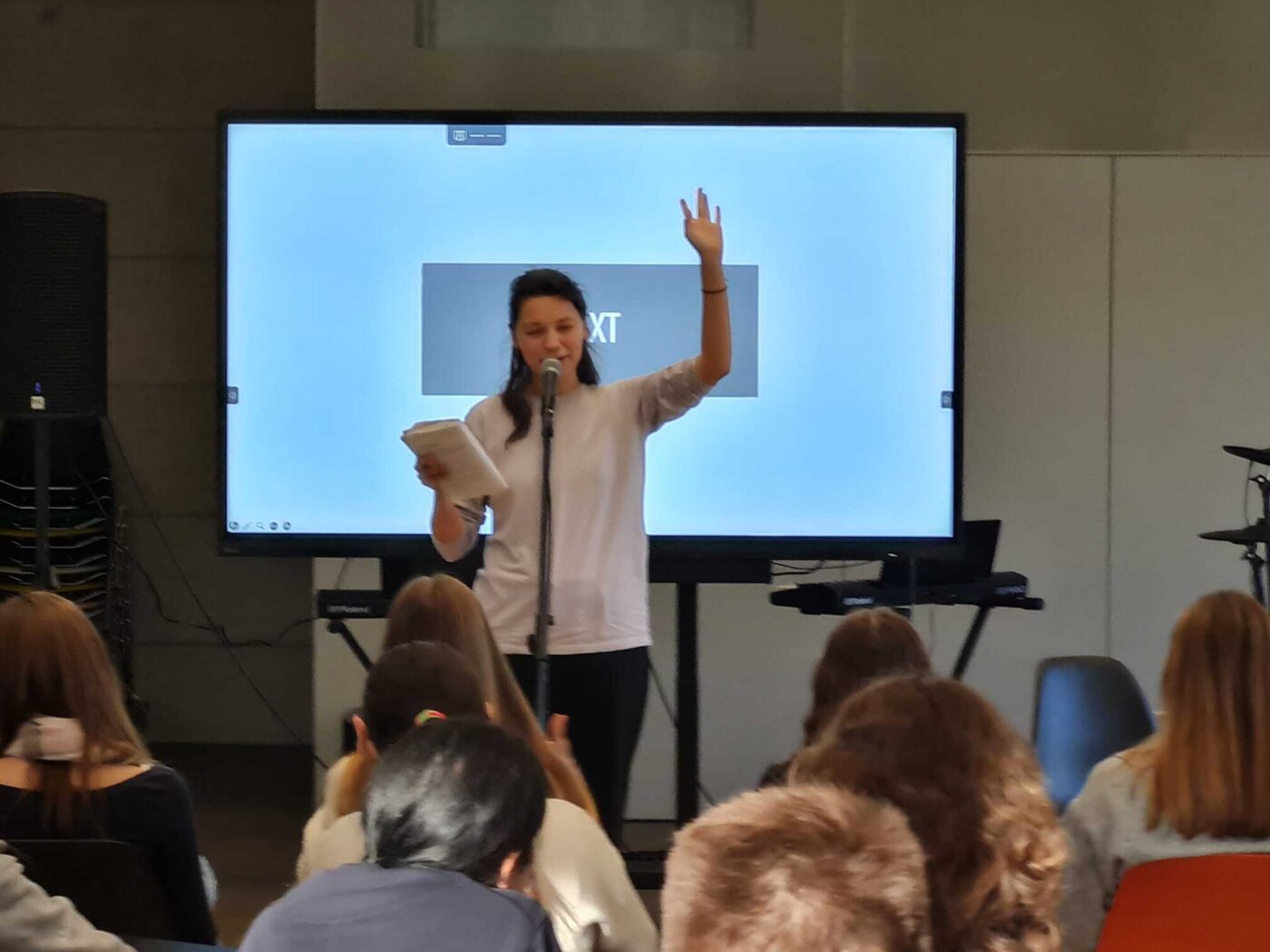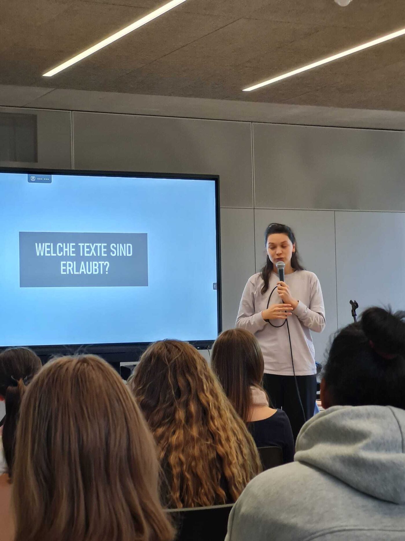 Im Lernatelier bekamen die Schülerinnen und Schüler die Gelegenheit, sich intensiv mit der Kunstform des Poetry Slams auseinanderzusetzen. Zu Beginn des Projekts besuchte Gina Walter aus Basel die beiden Abschlussklassen aus dem ZIP und präsentierte einen eindrucksvollen Poetry-Slam-Vortrag. Dieser bot nicht nur einen spannenden Einstieg in das Thema, sondern diente auch als Inspiration für die anschliessende kreative Arbeit.