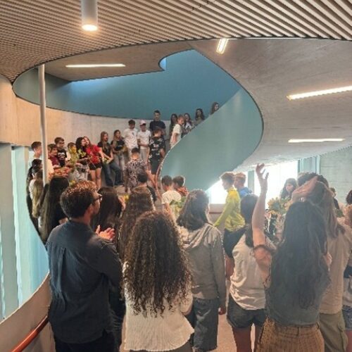 Ein besonderer Moment folgte um 9 Uhr: Die zweite und dritte Oberstufe bildeten auf der Wendeltreppe einen Spalier und hielten Sonnenblumen bereit. Unter Applaus gingen die neuen Schülerinnen und Schüler der ersten Oberstufe die Treppe hoch und wurden nochmals willkommen geheissen. Für die einen war es ein schöner Empfang, andere hätten sich in diesem Moment wohl am liebsten unsichtbar gemacht…unvergesslich war er aber sicher für alle. 😉