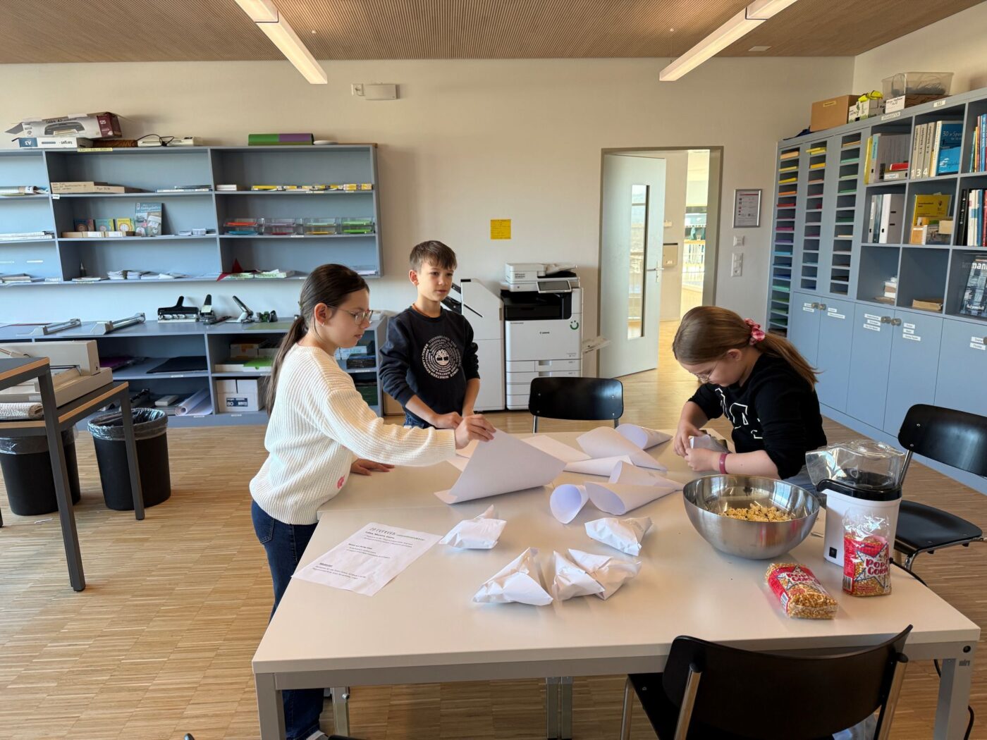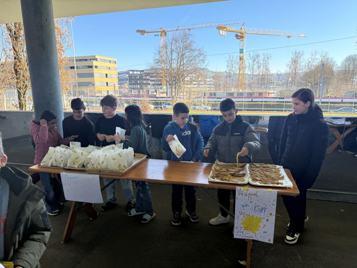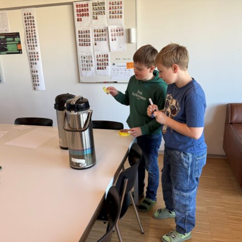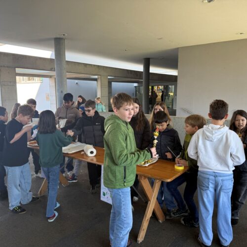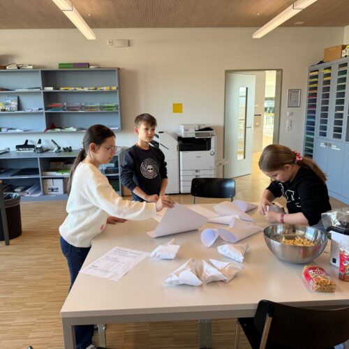 Nach dem gemeinsamen Diskutieren und Abstimmen in den beiden Klassen standen schlussendlich Pizza, Popcorn, saisonaler Früchtespiess mit wenig Schokolade und einem Gummibärli, Grittibänz/Osterhasen, Pommes (nicht frittiert), Punch/Sirup und Waffeln auf der Menükarte. Dann wurden Einkaufs- und Materiallisten erstellt, Bons ausgeschnitten, eingekauft und vorbereitet. Der Duft im ganzen Schulhaus liess die Vorfreude auf den Pausenkiosk steigern.