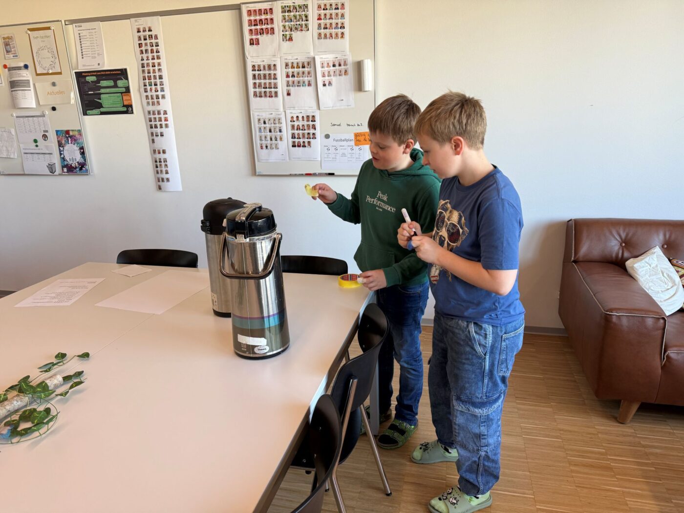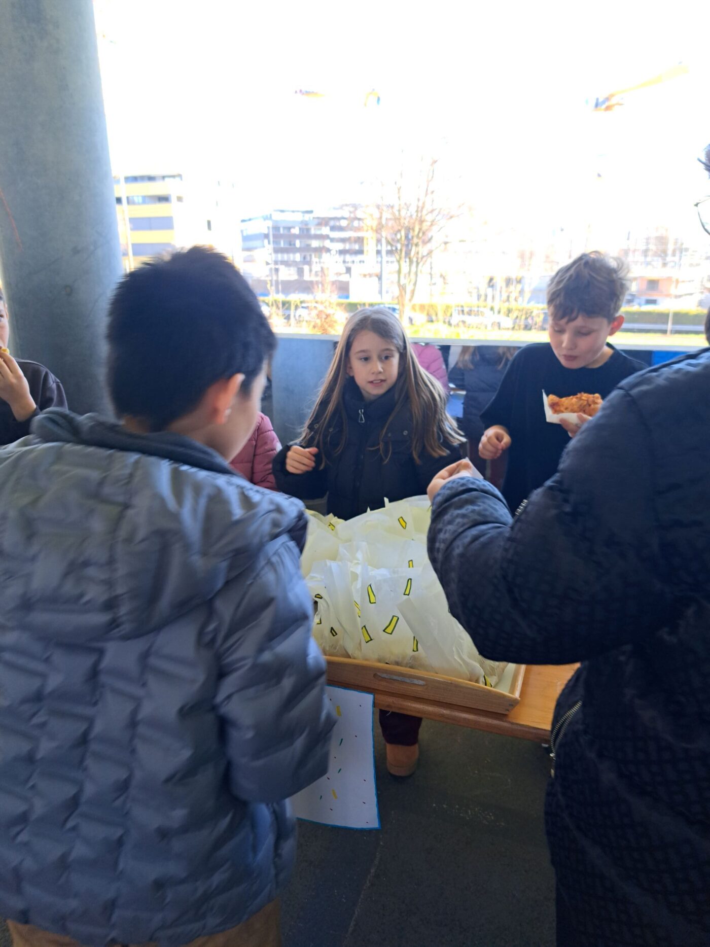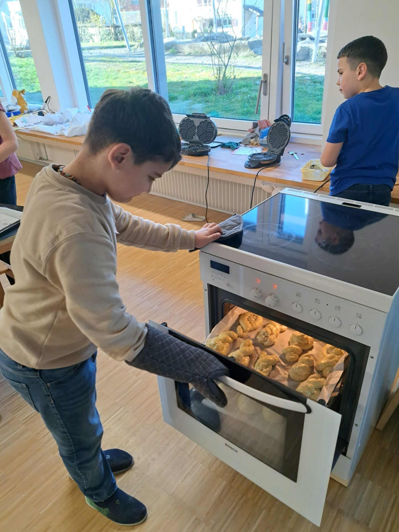 Nach dem gemeinsamen Diskutieren und Abstimmen in den beiden Klassen standen schlussendlich Pizza, Popcorn, saisonaler Früchtespiess mit wenig Schokolade und einem Gummibärli, Grittibänz/Osterhasen, Pommes (nicht frittiert), Punch/Sirup und Waffeln auf der Menükarte. Dann wurden Einkaufs- und Materiallisten erstellt, Bons ausgeschnitten, eingekauft und vorbereitet. Der Duft im ganzen Schulhaus liess die Vorfreude auf den Pausenkiosk steigern.