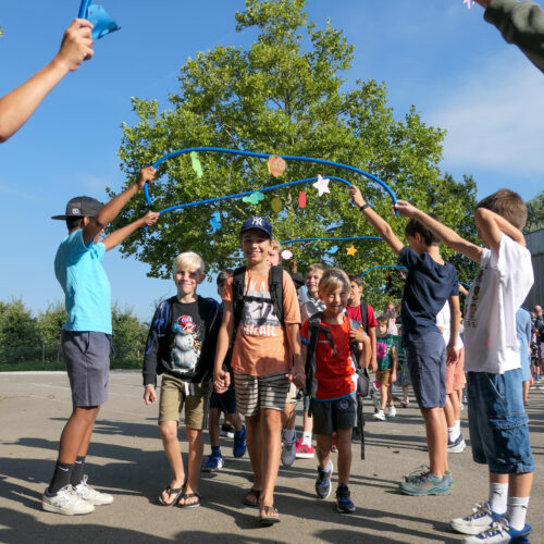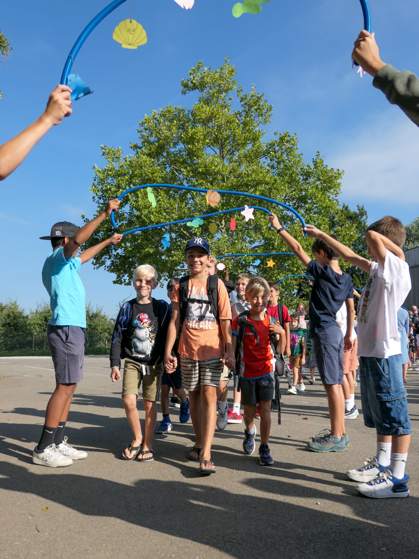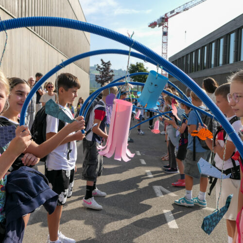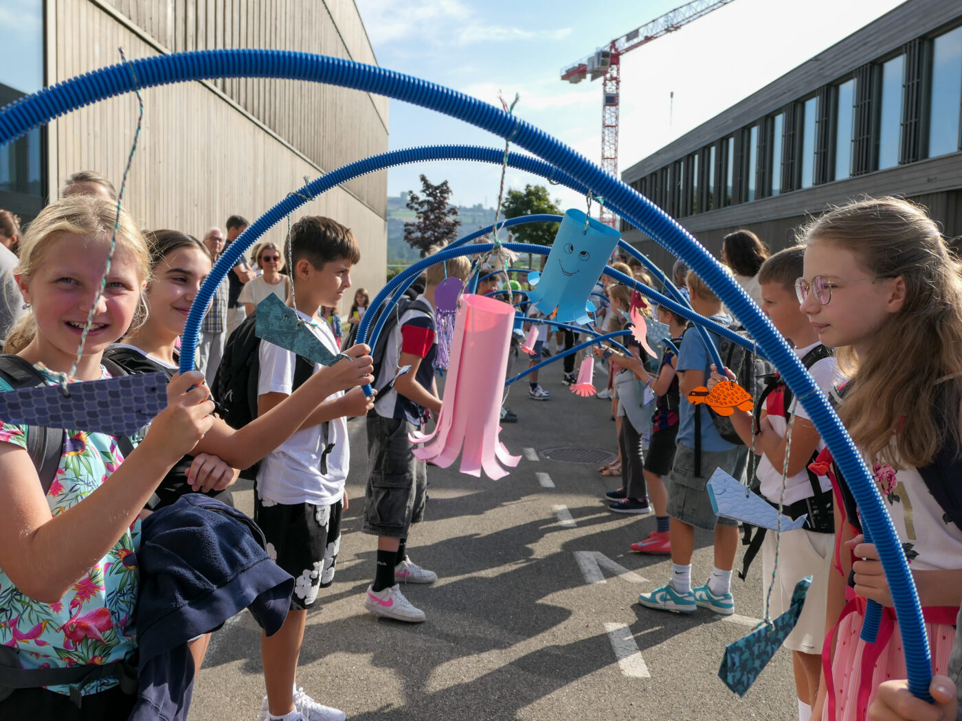Ganz besonders im Mittelpunkt standen an diesem Tag jedoch die jüngsten Mitglieder der Schulgemeinschaft: die frischgebackenen Erstklässlerinnen und Erstklässler. Freudestrahlend durften sie, Hand in Hand mit ihrem Götti oder ihrer Gotte aus der 6. Klasse, den blauen Tunnel durchschreiten, der passend zum Unterwassermotto gestaltet war. Unter den stolzen Blicken der Eltern gingen sie so in Richtung Pavillon, wo ihre Klassenlehrpersonen sie in Empfang nahmen und in ihre neuen Schulräume begleiteten.