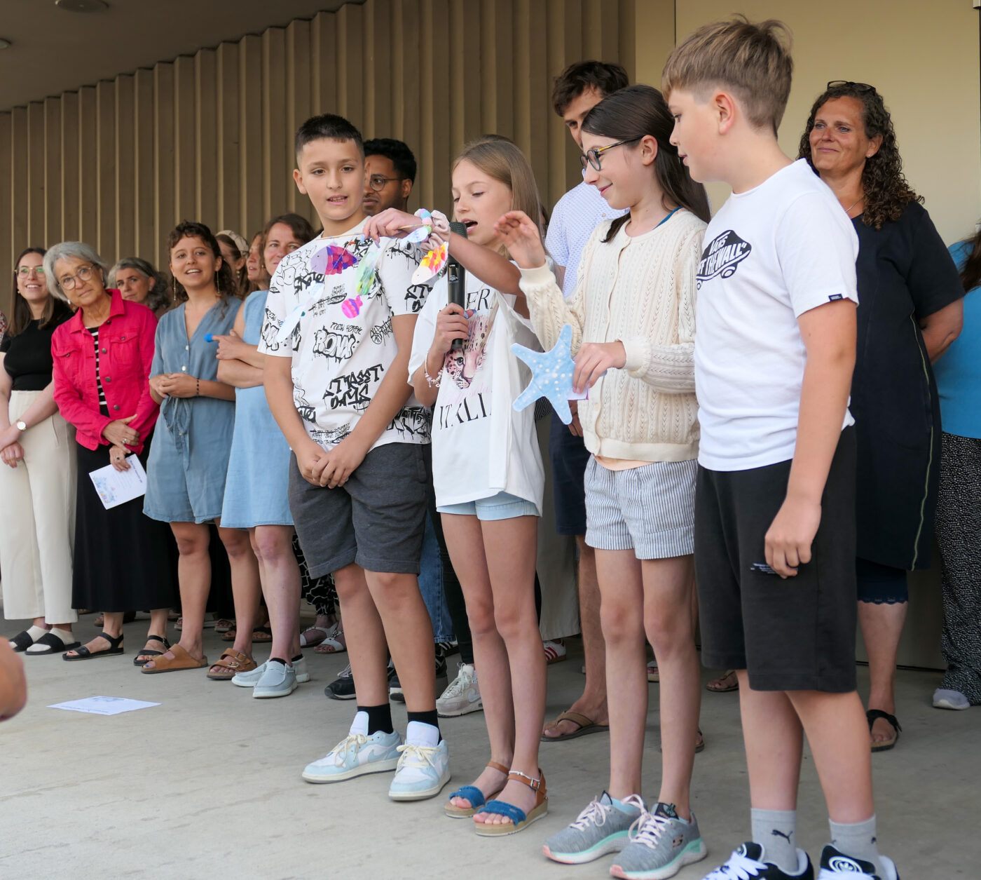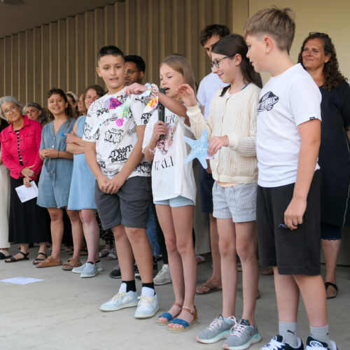 Einen besonderen Beitrag zum Auftakt des Schuljahres leisteten auch Anouk, Nina, Luan und Kilian aus der 6. Klasse. Vor versammelter Schulgemeinschaft stellten sie ihre Gedanken zum neuen Jahresmotto vor – und hatten dafür anschauliche Symbole mitgebracht: einen «Motivationsstein» für Durchhaltevermögen, einen Seestern als Zeichen für Mut und Selbstvertrauen sowie einen Fischschwarm, der für Freundschaft und Gemeinschaft steht. Für die vier Sechstklässler ist klar: Das Wichtigste im neuen Schuljahr ist, miteinander Spass zu haben, zusammenzuhalten und anstehende Aufgaben mit Freude zu meistern. Ihr Beitrag wurde von der Schulleiterin mit einem feinen Znüni verdankt.
