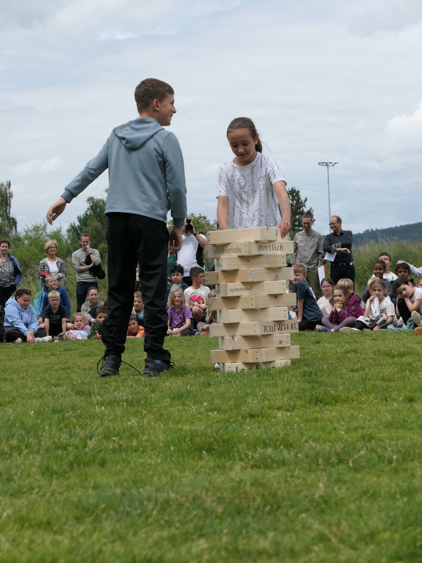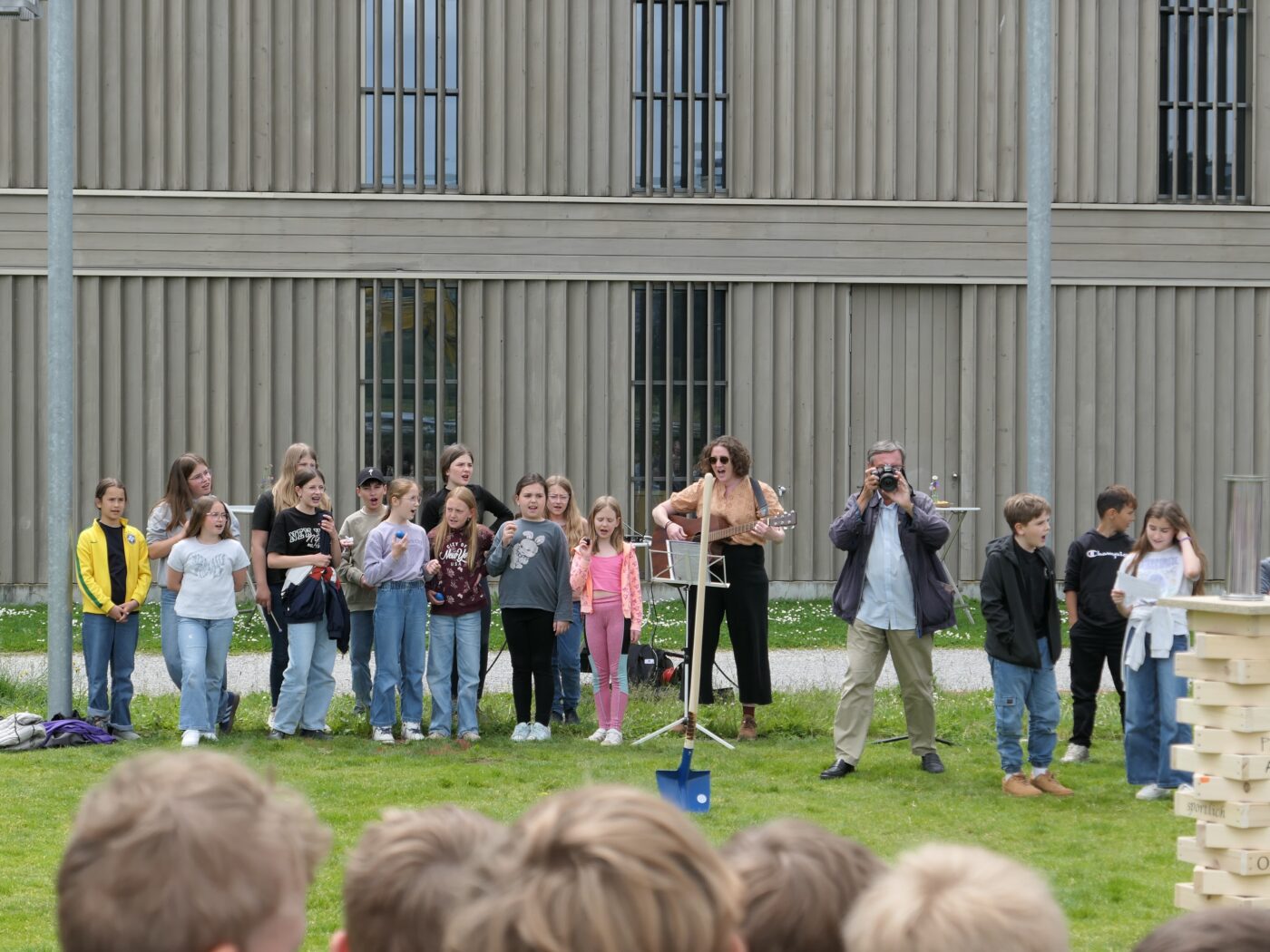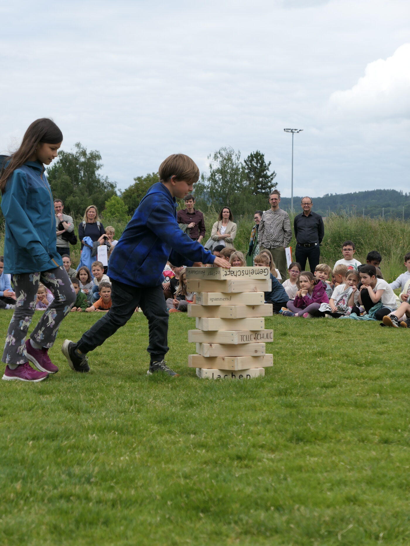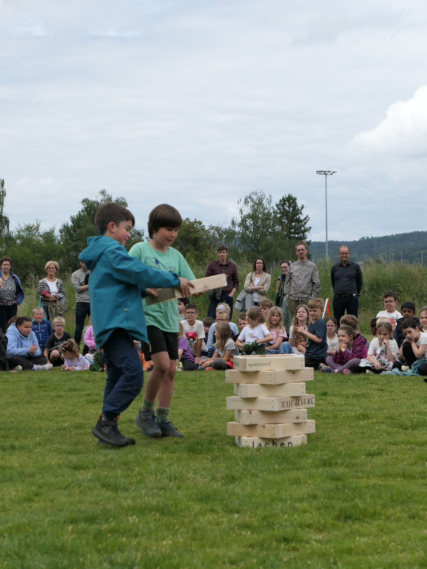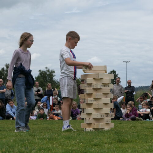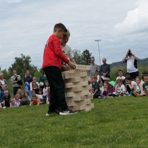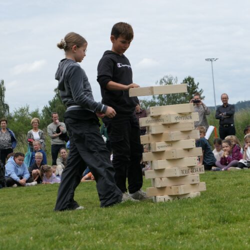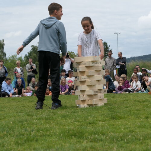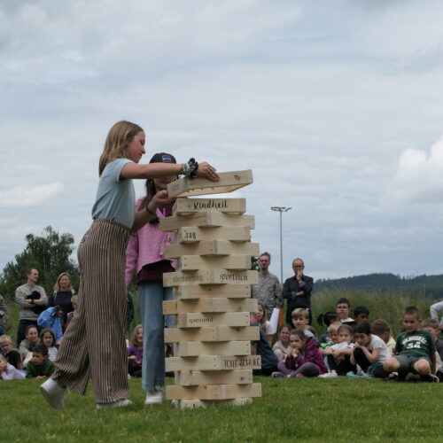 Musikalisch wurde der Anlass vom Schulchor PopChorn umrahmt, der mit seinen Darbietungen für festliche Atmosphäre sorgte. Ein weiterer Höhepunkt war der symbolische Turm, der aus Rahmen aus Kapla-Hölzern errichtet wurde. Jede Klasse hatte im Vorfeld einen solchen Rahmen gestaltet und mit Begriffen versehen, die für sie das Schulleben ausmachen. Begriffe wie spannend, lustig, grosser Pausenplatz, Herbstwanderung oder Natur zeugten von der Vielfalt und Lebendigkeit des Schulalltags.