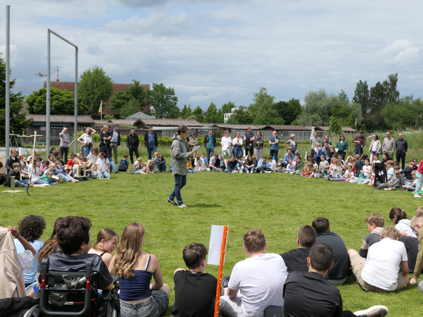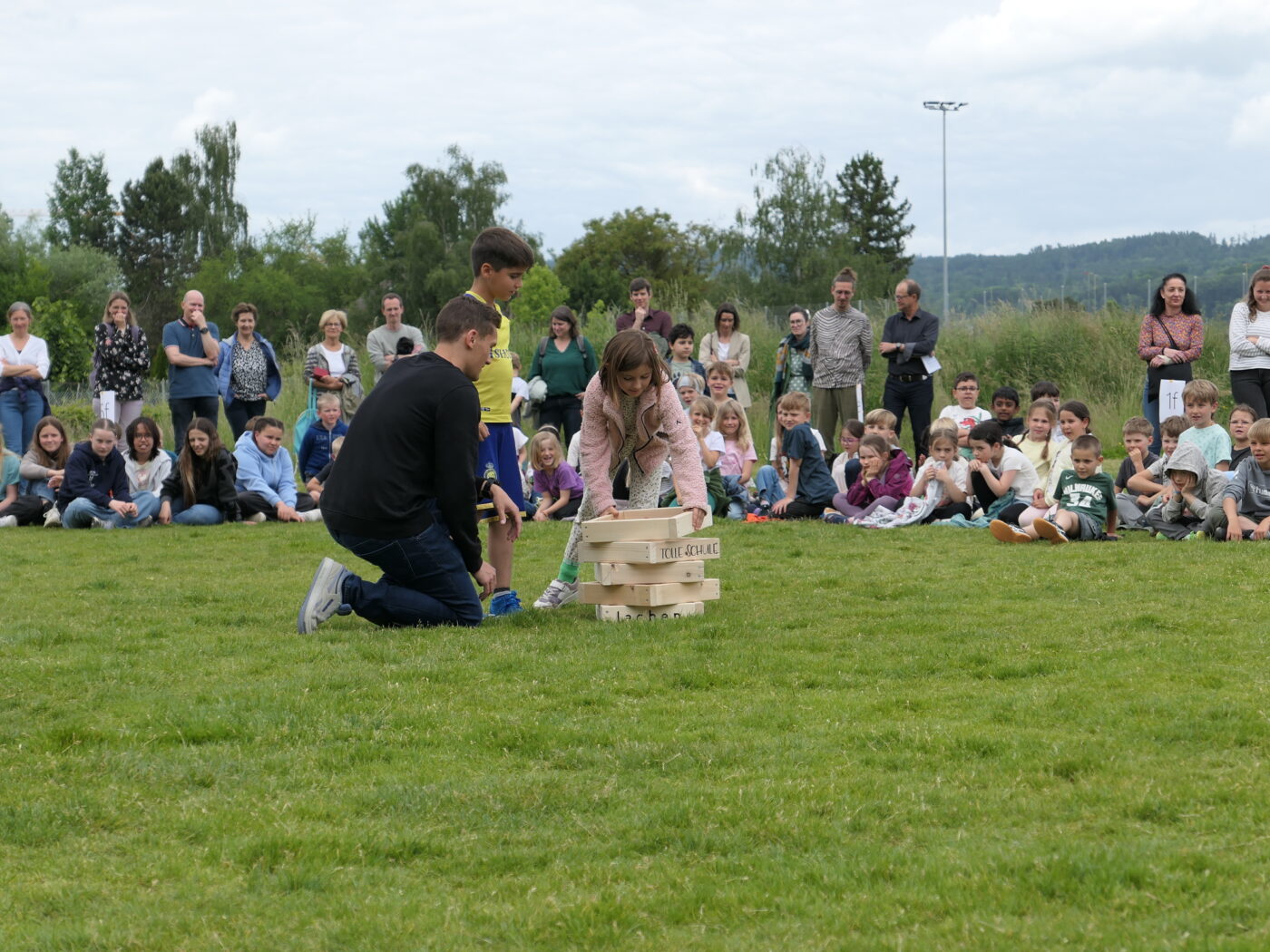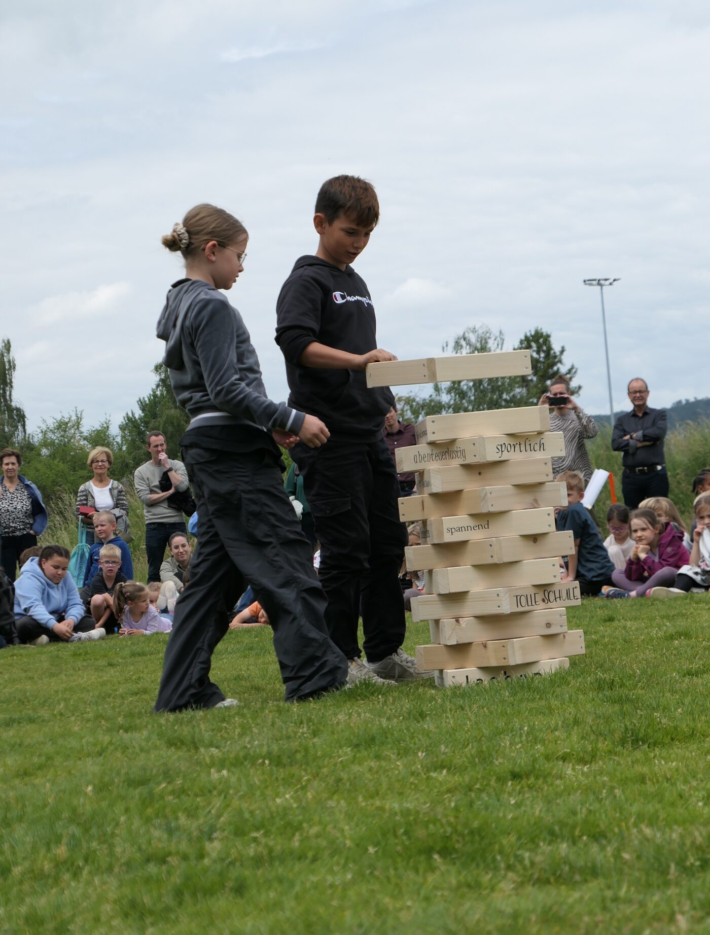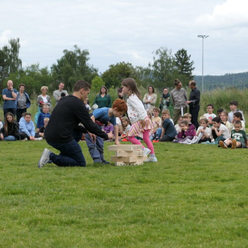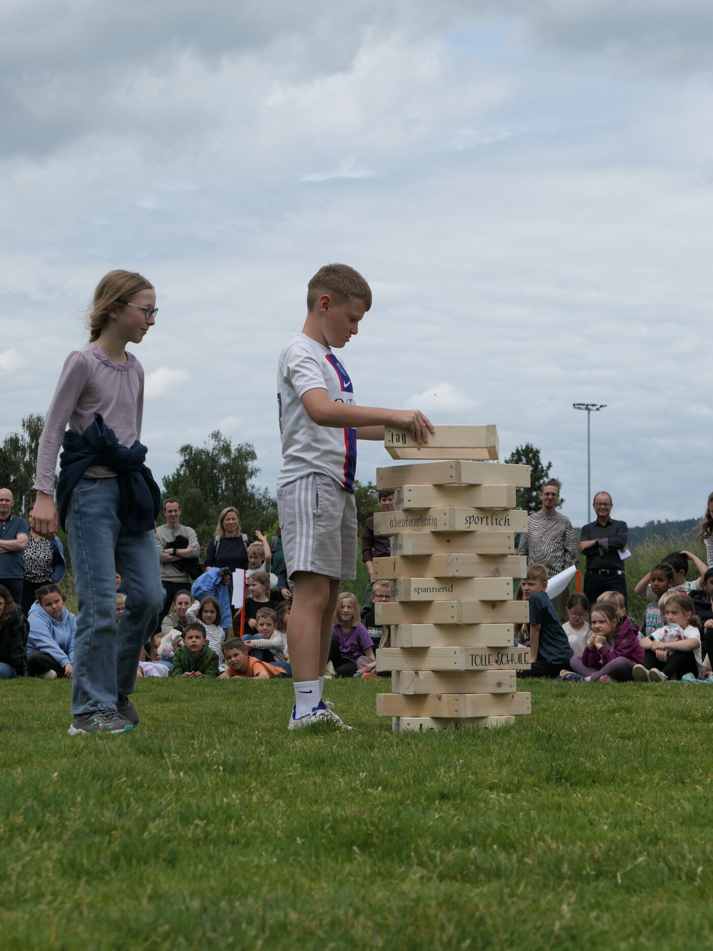 Musikalisch wurde der Anlass vom Schulchor PopChorn umrahmt, der mit seinen Darbietungen für festliche Atmosphäre sorgte. Ein weiterer Höhepunkt war der symbolische Turm, der aus Rahmen aus Kapla-Hölzern errichtet wurde. Jede Klasse hatte im Vorfeld einen solchen Rahmen gestaltet und mit Begriffen versehen, die für sie das Schulleben ausmachen. Begriffe wie spannend, lustig, grosser Pausenplatz, Herbstwanderung oder Natur zeugten von der Vielfalt und Lebendigkeit des Schulalltags.