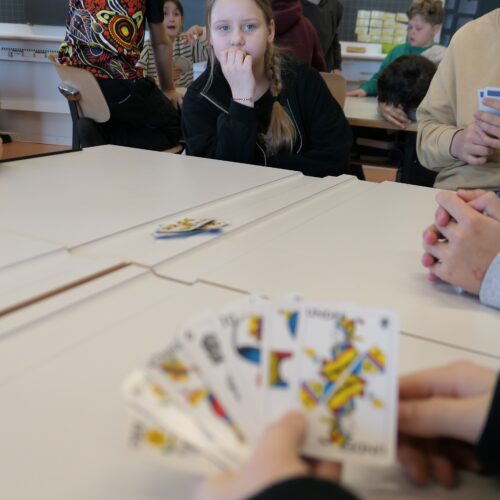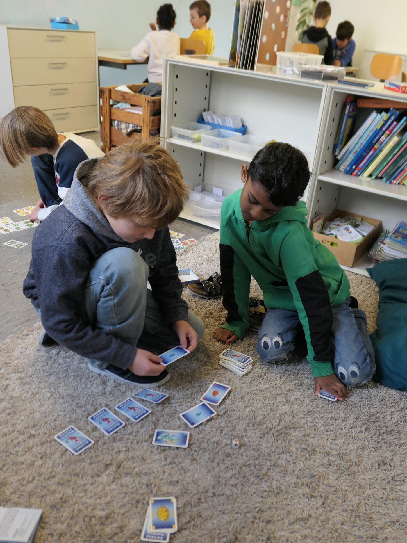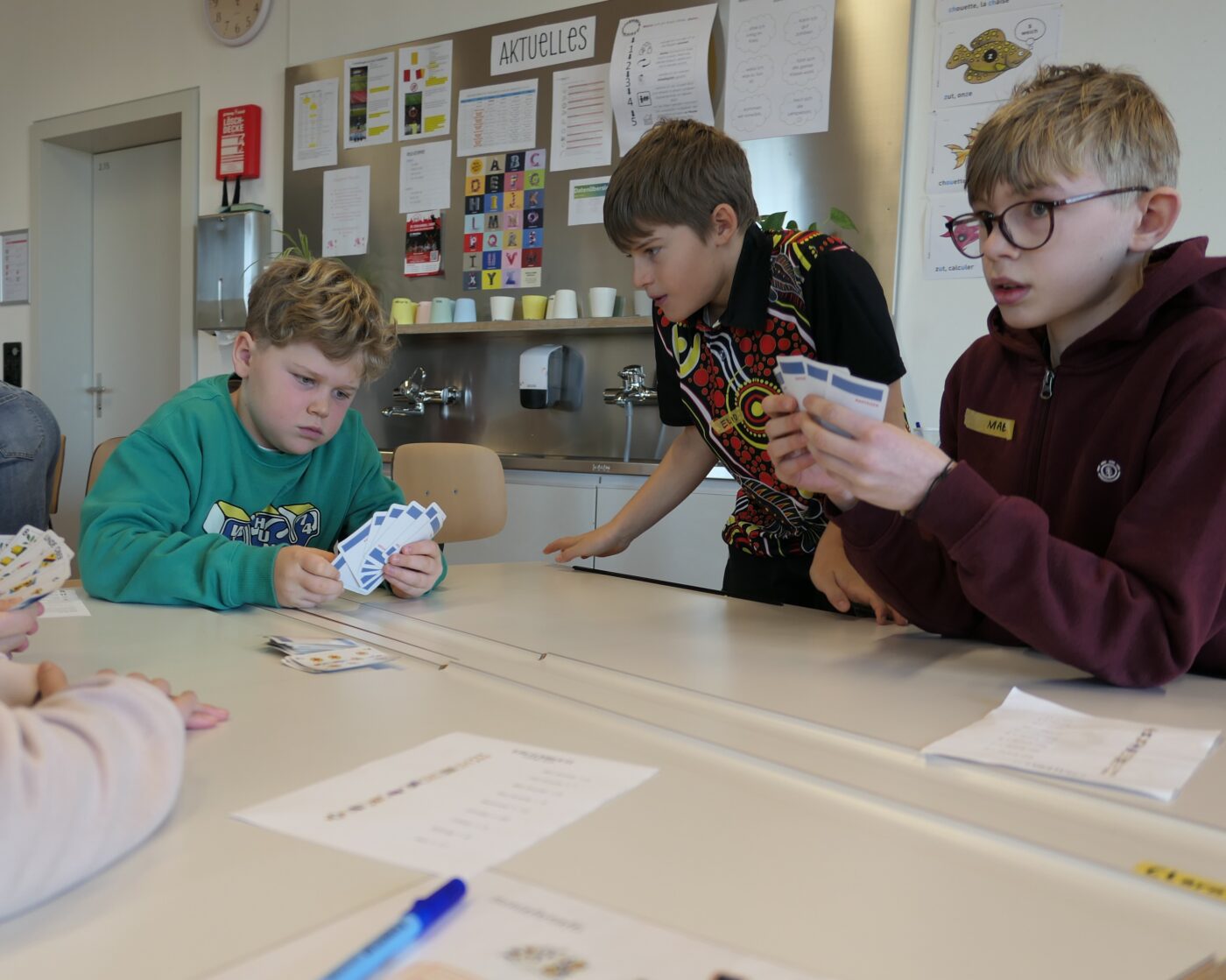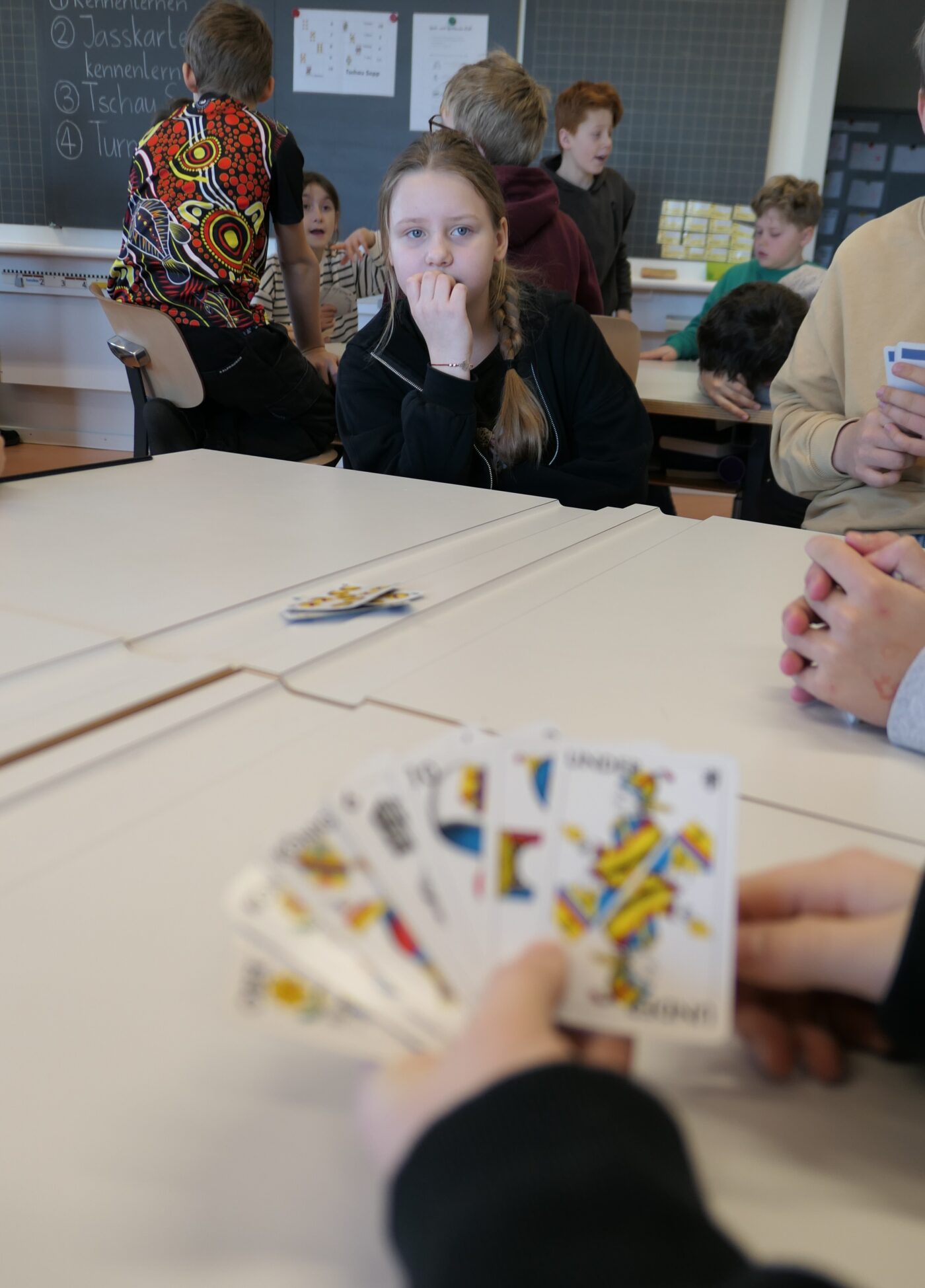 Besonders schön war zu beobachten, wie sich die Kinder in den verschiedenen Ateliers gegenseitig unterstützten. Während einige in bestimmten Bereichen ihre Stärken einbringen konnten, waren andere in anderen Ateliers besonders geschickt – so lernten die Kinder voneinander und miteinander. Beim Kartenspiel „Tschau Sepp“ setzten sich die Schülerinnen und Schüler zudem mit den Deutschschweizer Jasskarten auseinander, deren Kenntnis heute nicht mehr für alle selbstverständlich ist.