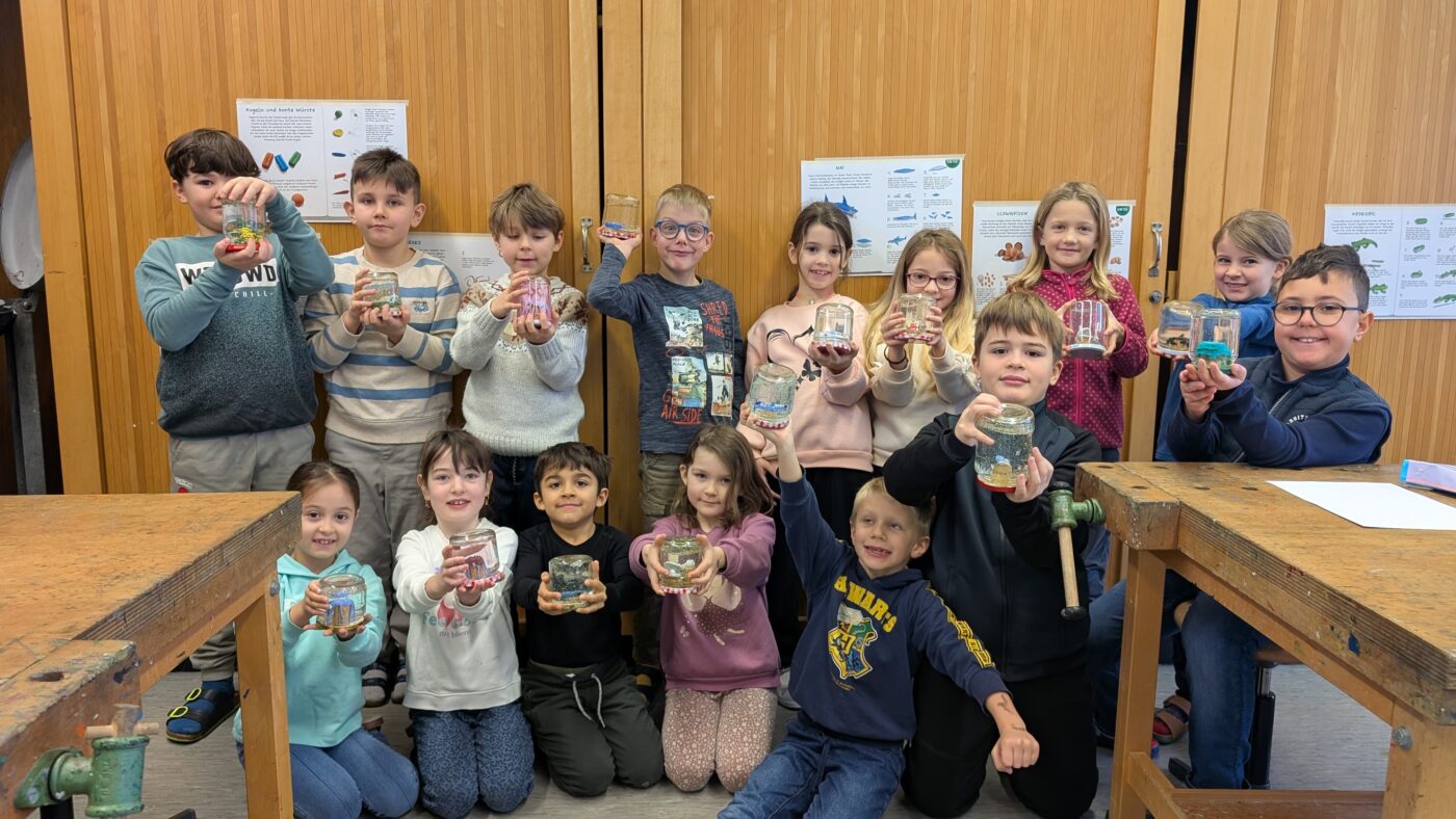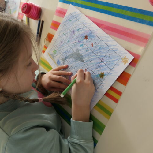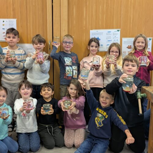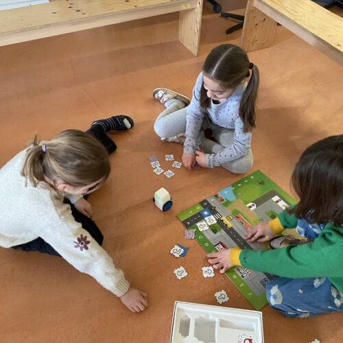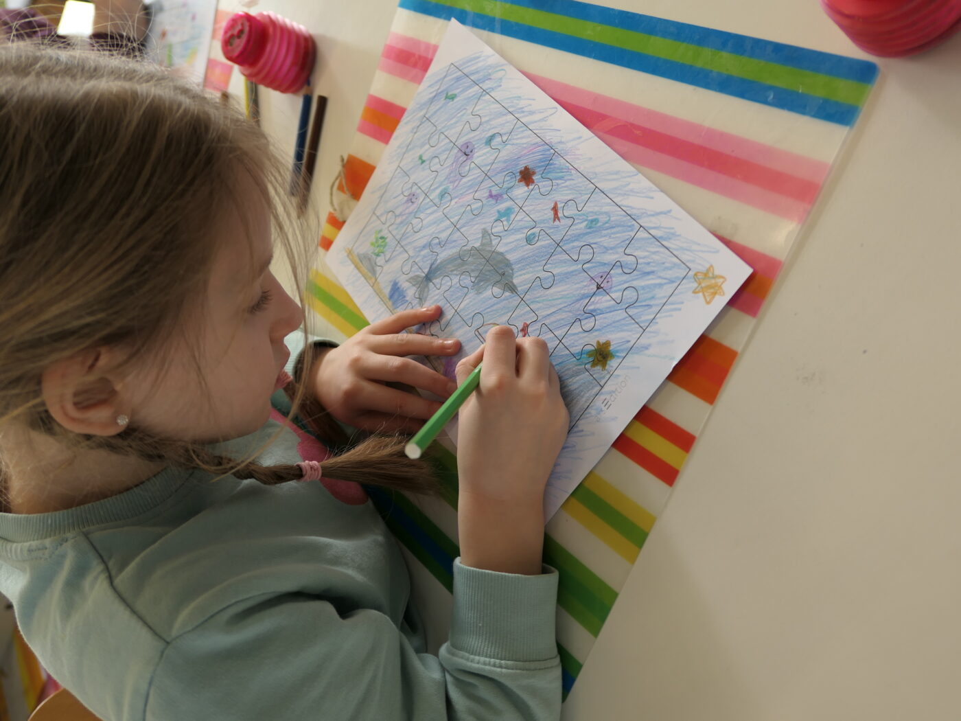 Jeden Tag besuchten die Gruppen ein anderes Atelier, sodass alle Kinder ein sehr abwechslungsreiches Programm erleben konnten. Das Angebot war vielfältig: Es umfasste Gesellschafts- und Gruppenspiele, das Vergleichen digitaler Spiele von früher und heute, BrainFitness, Spiele im Freien, Kartenspiele wie „Tschau Sepp“ sowie kreative Angebote, bei denen mit verschiedenen Gegenständen gebaut oder eigene Spiele hergestellt wurden. Passend zum Jahresmotto „Unterwasser“ gestalteten die Kinder zum Beispiel ein grosses gemeinsames Kunstwerk auf einer langen Papierrolle oder Schüttelgläser.