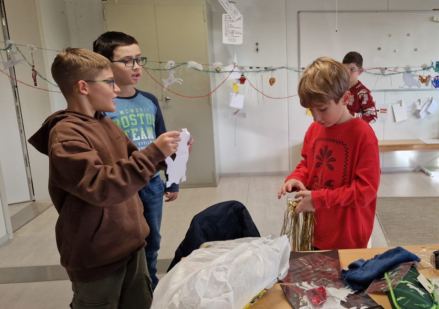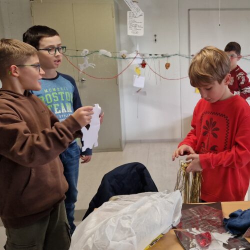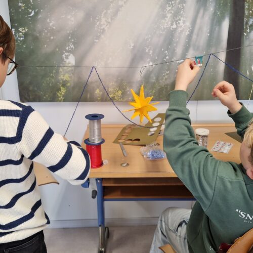 Am Freitagnachmittag wurde es in unserer Schule festlich und kreativ. Die Schülerinnen und Schüler aus der 3./4. Klasse trafen sich in gemischten Fünfergruppen, um gemeinsam Weihnachtsdekoration für den Palast zu gestalten. Jede Gruppe hatte die Aufgabe, eine eigene Weihnachtsgirlande zu entwerfen – und dabei ihrer Fantasie freien Lauf zu lassen.