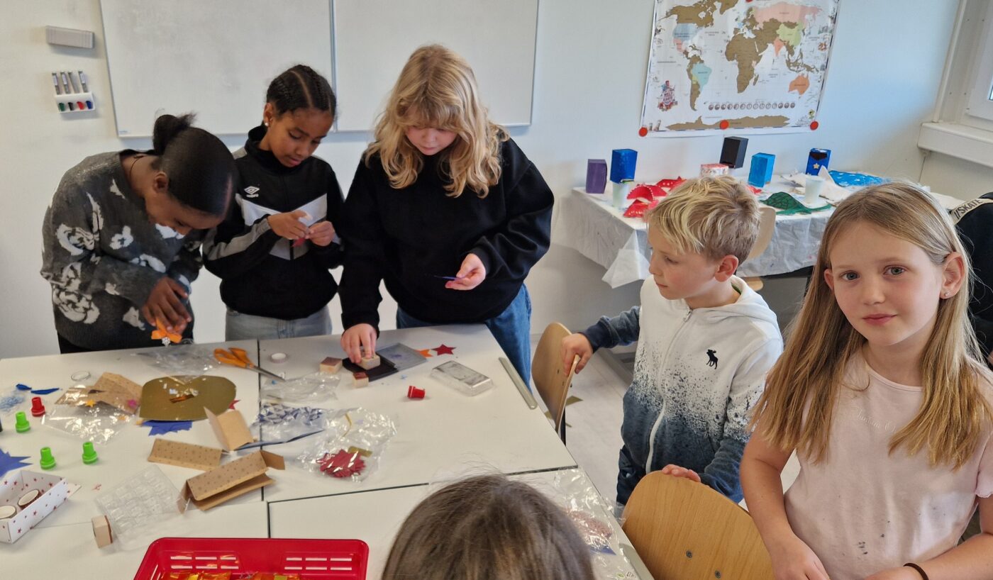 In einem separaten Materialraum standen den Kindern zahlreiche Bastelmaterialien zur Verfügung: bunte Papiere, Naturmaterialien, Glitzer, Stoffreste, Schleifenbänder und vieles mehr. Schnell entstanden erste Ideen, und die Gruppen machten sich motiviert ans Werk. Dabei zeigte sich, wie wertvoll Zusammenarbeit sein kann: Die Kinder besprachen ihre Gestaltungspläne, verteilten Aufgaben und unterstützten sich gegenseitig, wenn etwas nicht auf Anhieb klappte.