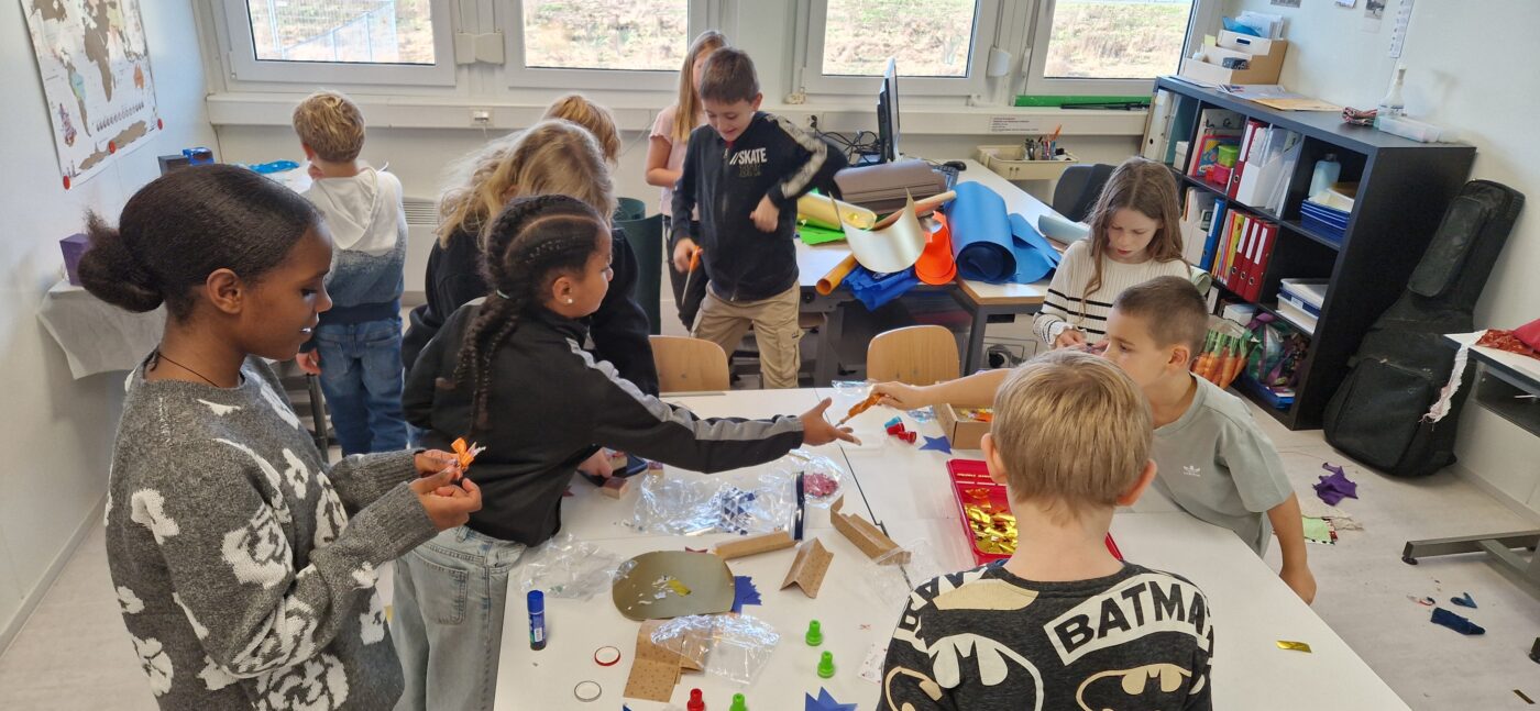 In klassenübergreifenden Gruppen entstanden festliche Girlanden für die Gänge im Palast. Die Kinder der Mittelstufe bastelten einen Nachmittag lang dekorative Girlanden und lernten dabei das eine oder andere noch unbekannte Kind aus einer anderen Klasse kennen. Nun glänzt und glitzert es im Palast, und die Deko erinnert an den gelungenen Bastelnachmittag.