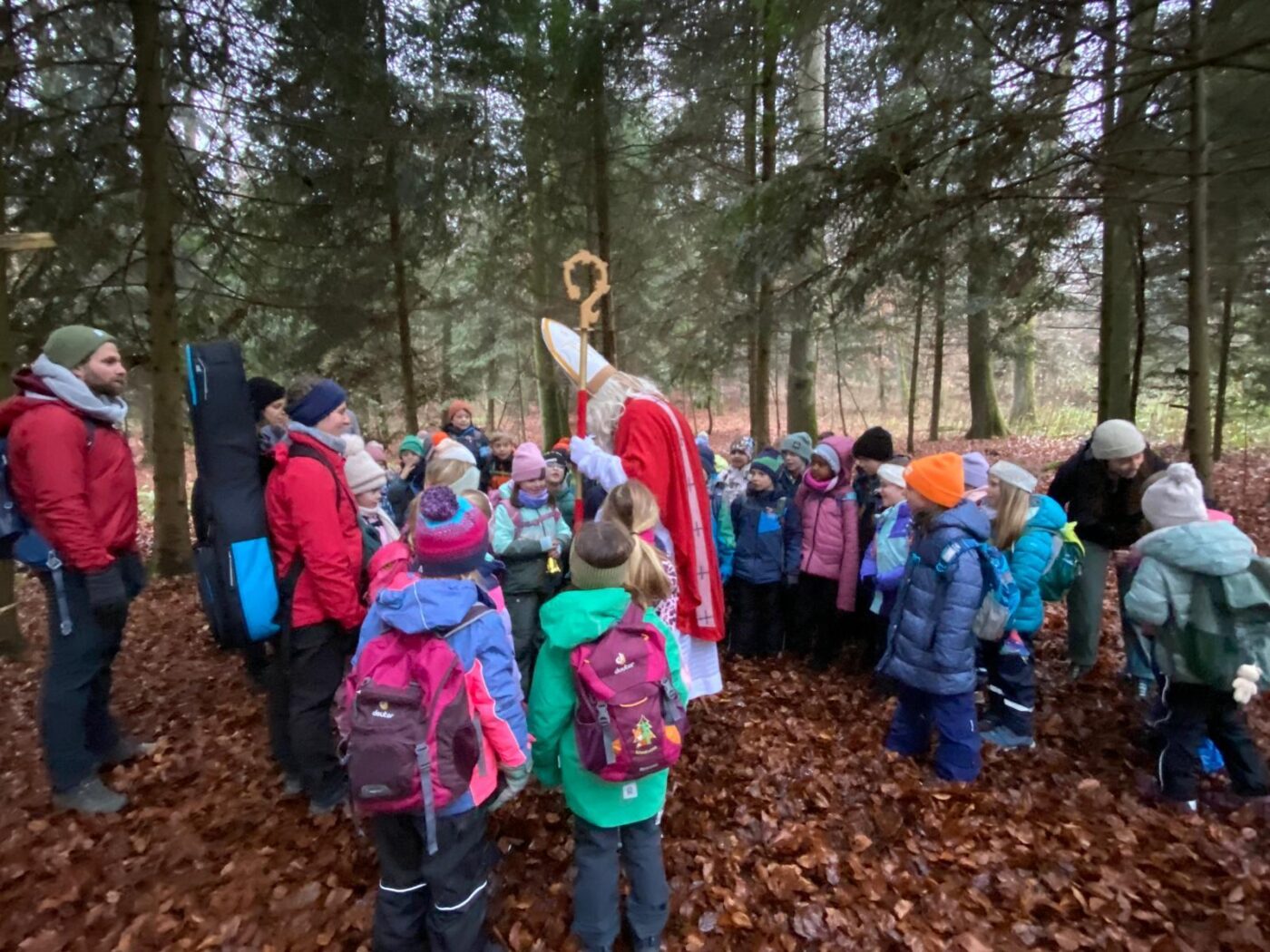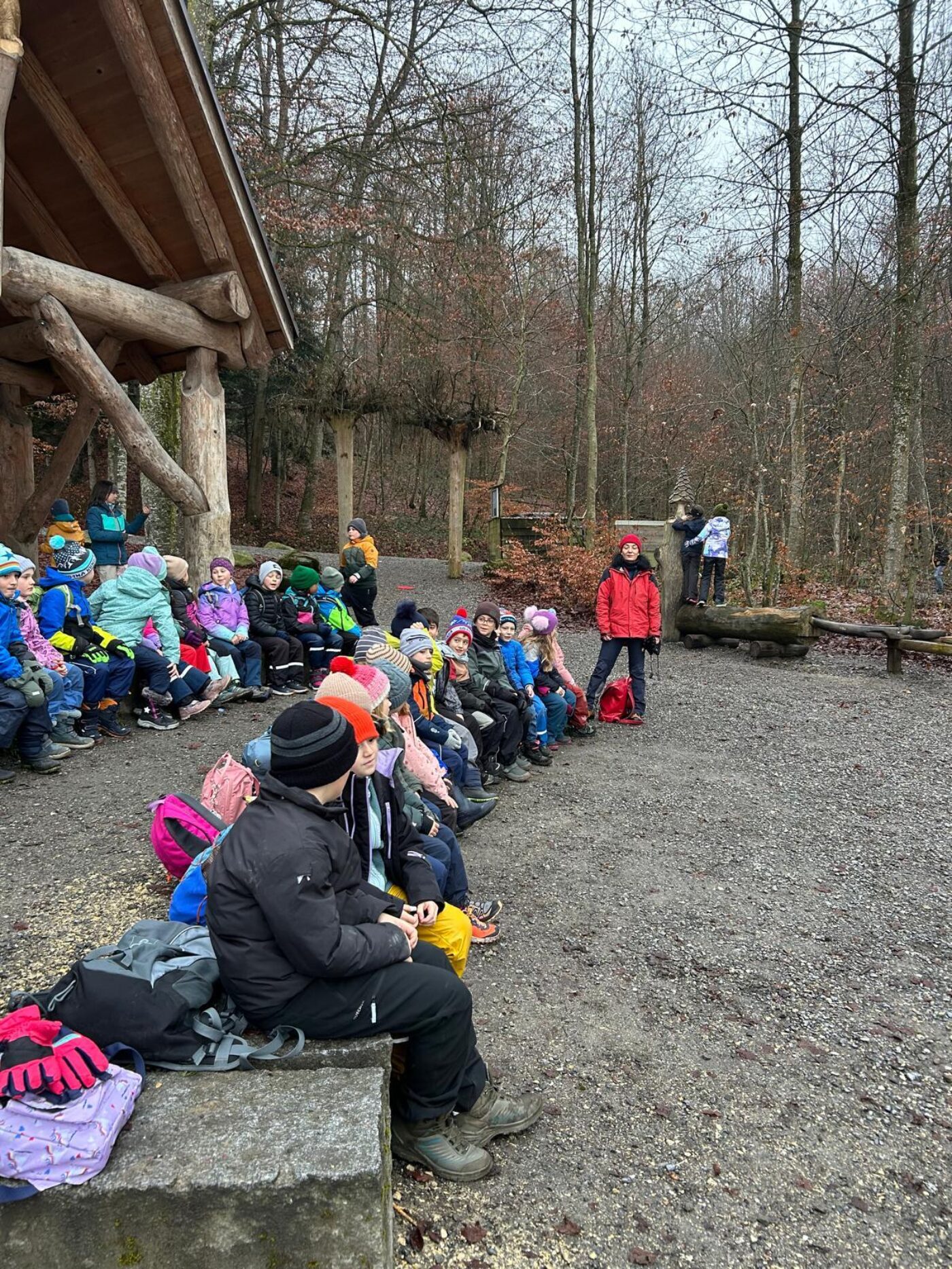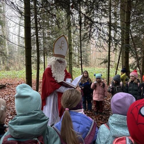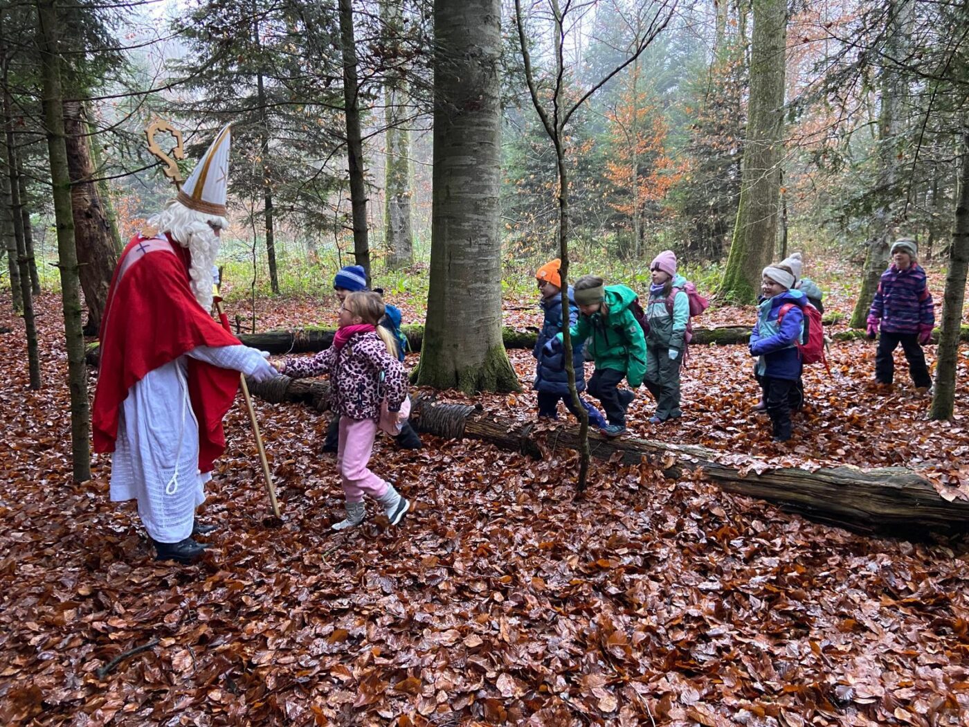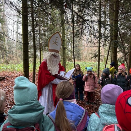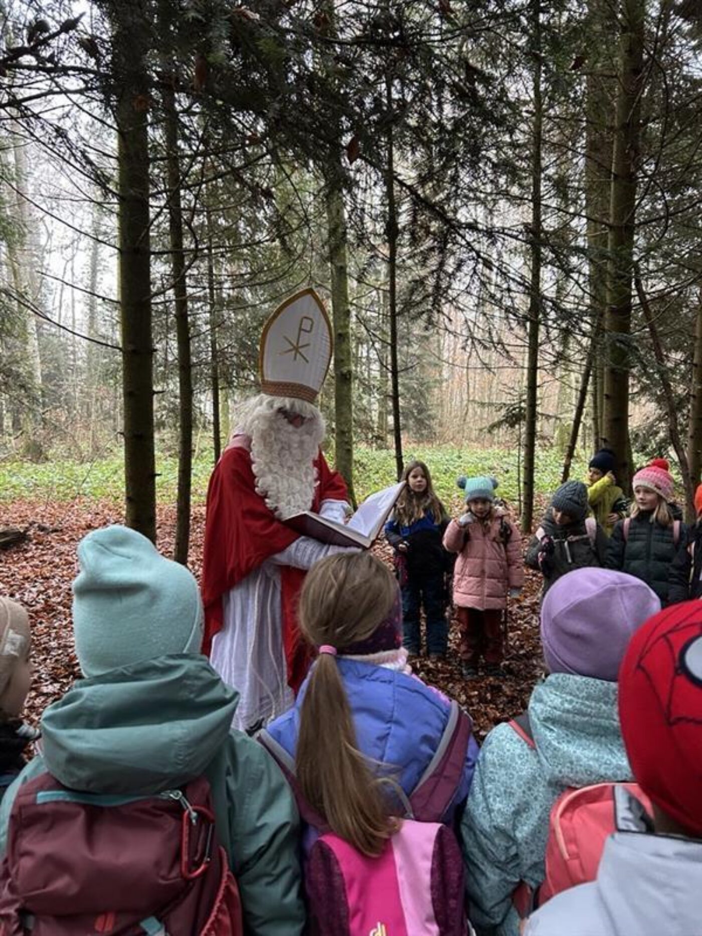 Mit grosser Aufregung und Vorfreude machten sich die 1./2.-Klässler auf den Weg in den Wald, um den Samichlaus zu treffen. Im Haselwartwald sangen sie zunächst ein Weihnachtslied. Danach durfte jeweils eine Gruppe von Kindern zum Samichlaus, der ihnen eine stimmungsvolle Geschichte vorlas. Währenddessen genossen die anderen Kinder ihr Znüni und spielten im Wald, bevor auch sie den Samichlaus besuchen konnten.